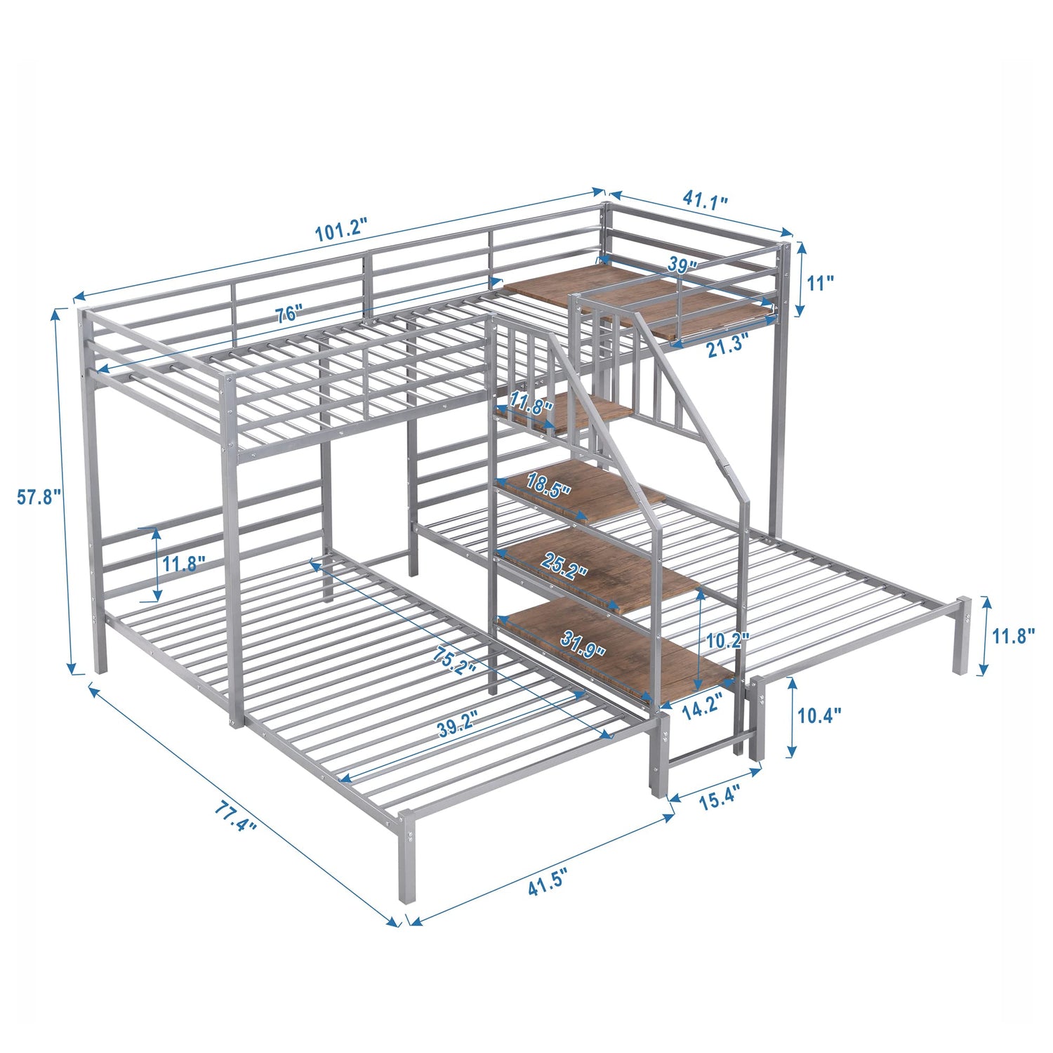 - 【Upper Bed with Storage Board】 The 21.3" x 39" MDF material shelf beside the upper bed offers storage space for daily necessities and toys. Overall Product Dimension: 101.2''L x 77.4''W x 57.8''H, Upper Bed Dimension: 76'' x 39'', Each Down Bed Dimension: 75.2'' x 39.2'', Mattress dimension: 75 x 54inches (L x W). Mattress is not included. Each Bed Weight Capacity: 300lb