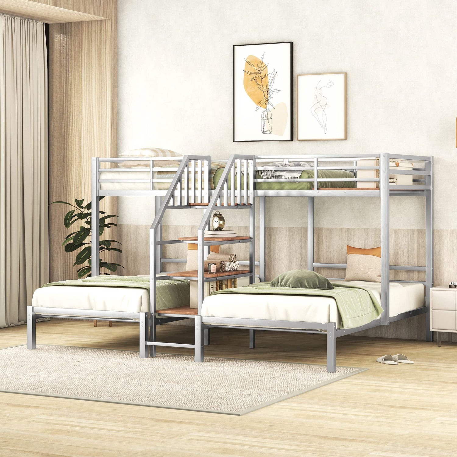 Harper & Bright Designs Metal Triple Bunk Bed with Stairs, 3 Beds Bunk Bed, Twin Over Twin & Twin Bunk Bed with Storage Shelves Staircase, for Kids Teens Adults, Silver