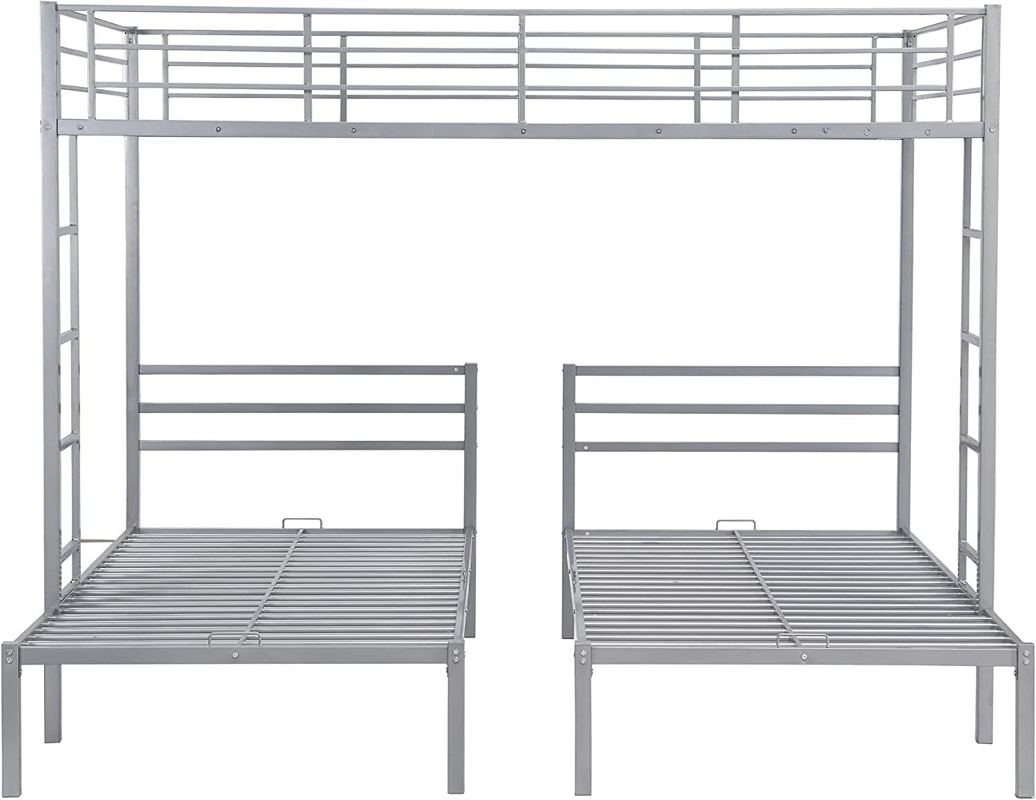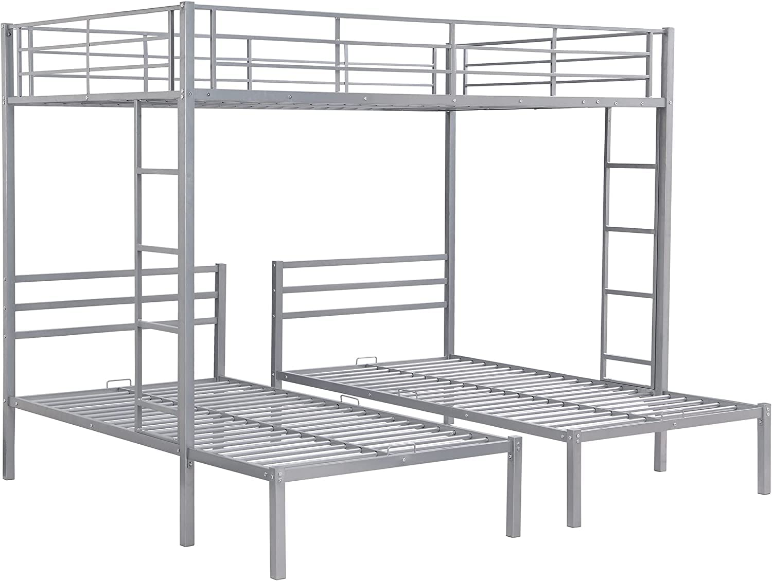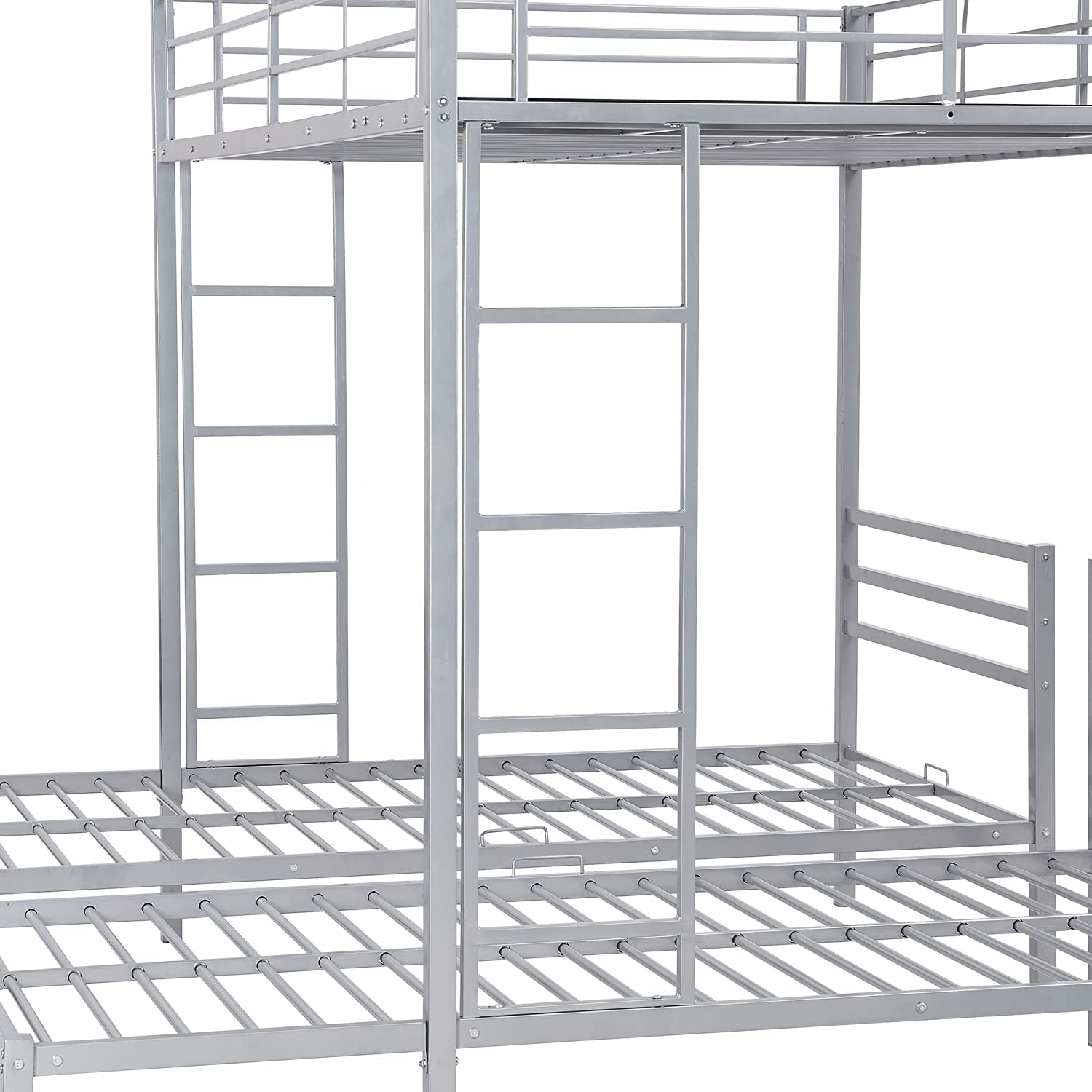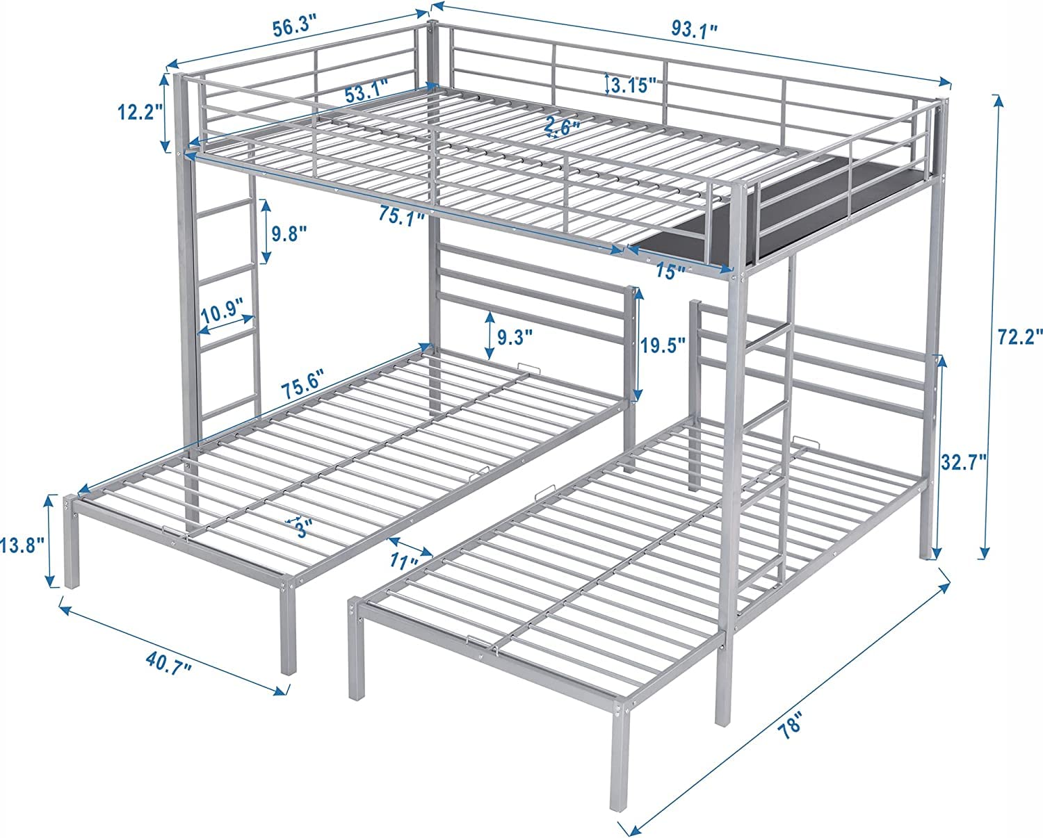 • 【Sturdy Metal Bunk Bed Frame】 This full over twin over twin bunk beds is made of premium metal with powder-coated that is antirust and durable enough for long time worry-free using. Additionally, comes with solid steel slats, this three bunk beds is used without a box spring.The metal slats support the mattresses not to slide and increase the mattresses life.