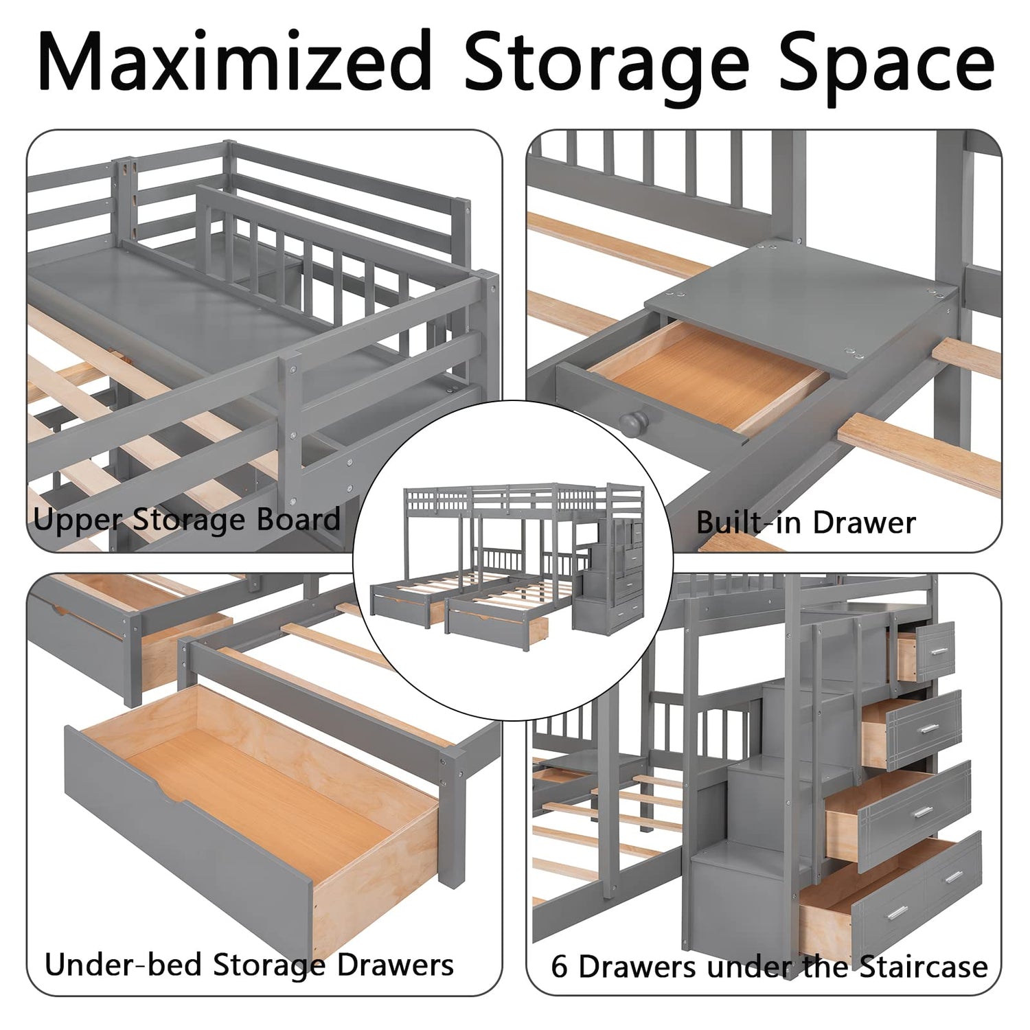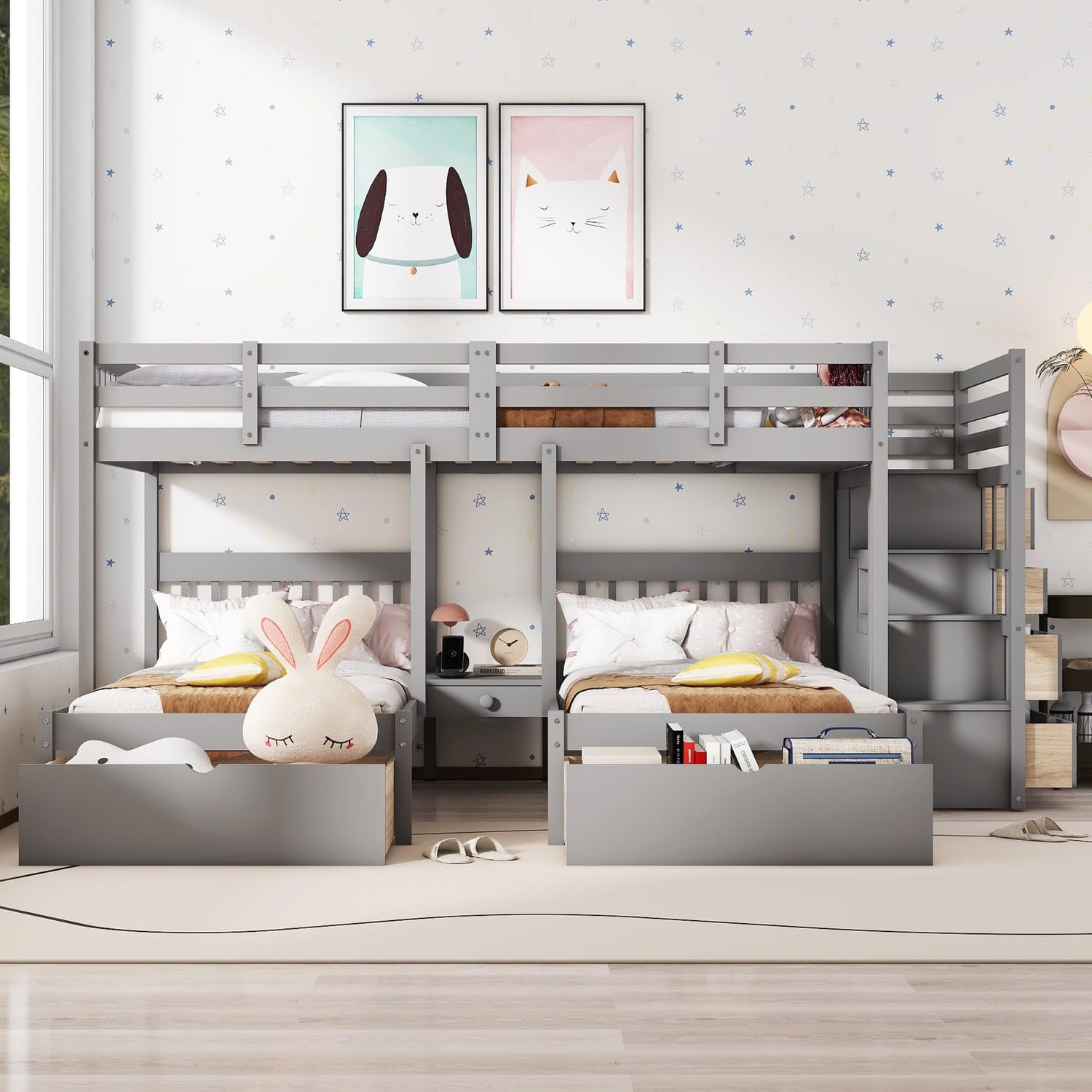 Harper & Bright Designs Grey Triple Bunk Beds with Drawers and Storage Staircase - Full Over Twin & Twin Design