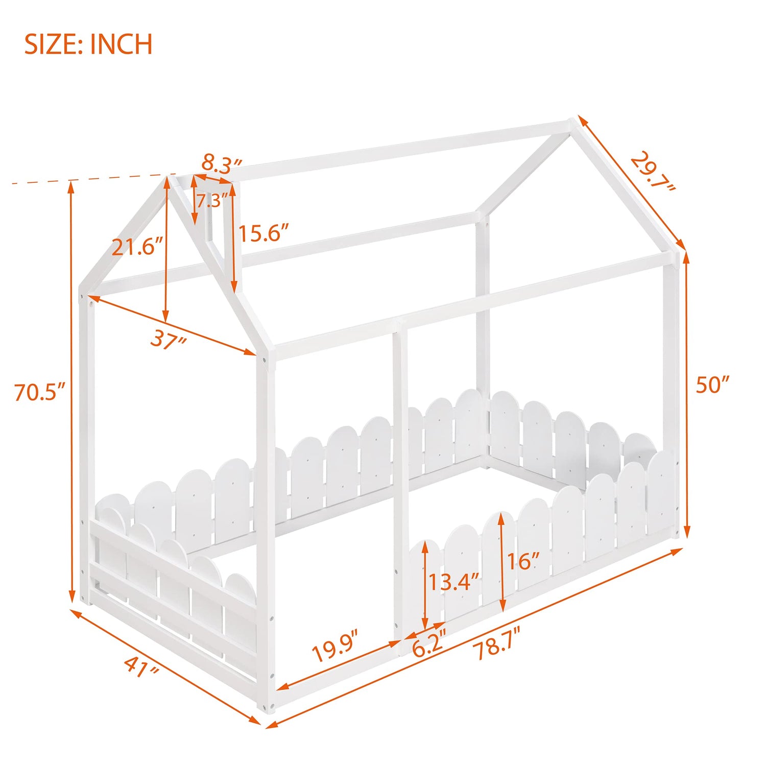 Twin Floor Bed with Fence Rails by Harper & Bright Designs - White Montessori House Bed for Kids