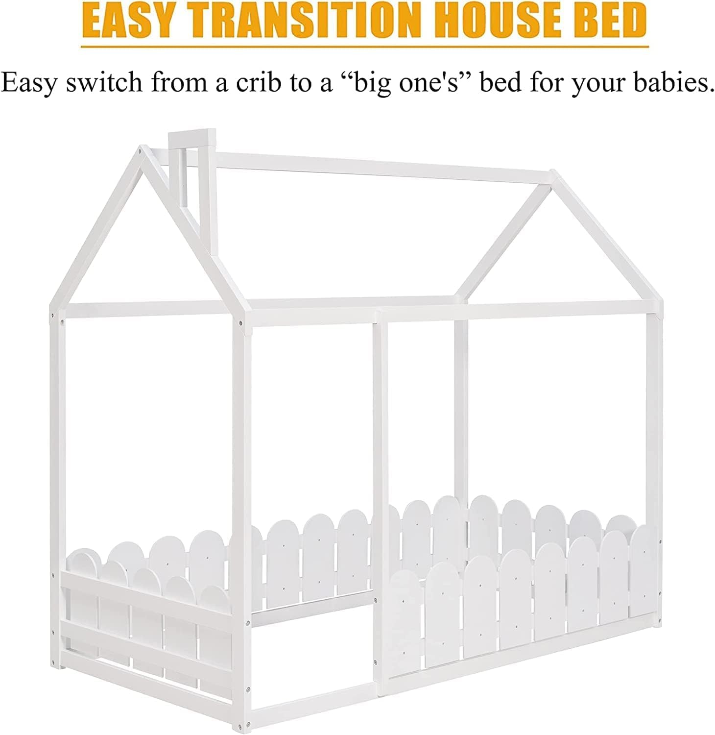 Transform your child's bedroom into a charming haven with the Twin Floor Bed with Fence Rails by Harper & Bright Designs. This delightful white Montessori house bed combines safety, style, and functionality, making it an ideal choice for your little one's sleep space.