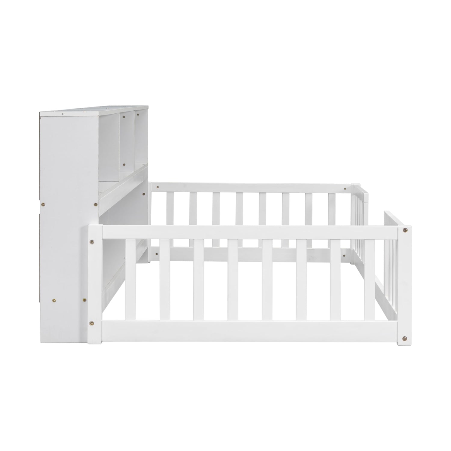 Harper & Bright Designs Twin Floor Bed with Bedside Bookcase, Shelves, Guardrails, Wood Montessori Bed with Storage, White