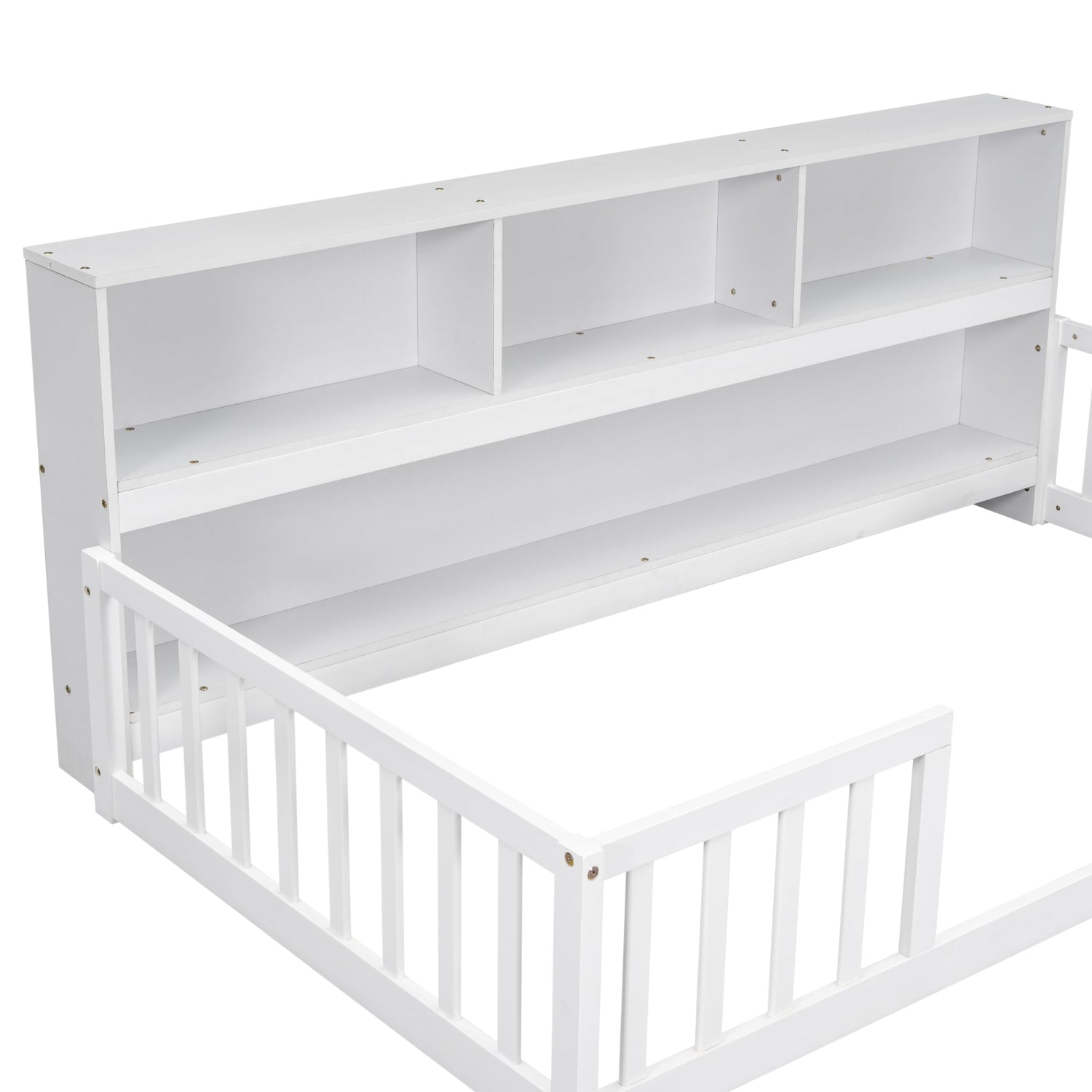 - 【Twin Size Floor Bed with Bedside Bookcase】 The multifunctional function bookcase attached to a bedside in full length contains distinct compartments that can be used to decorate and store books, toys, lamps and other accessories. This intelligible design saves the extra space and cost for the need of a bedside cabinets, and it’s the perfect solution for small living space- transforming a small chaotic space to a neat and fascinating bedroom.