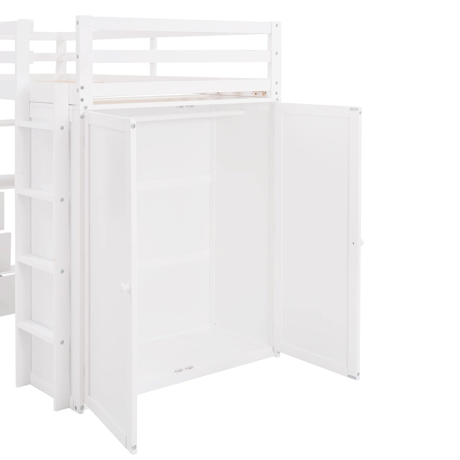 Stylish Twin Loft Bed with Desk and Wardrobe for Kids and Teens, White Wood Frame with Storage Drawers