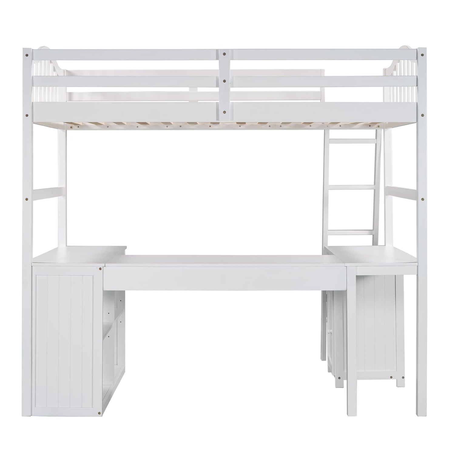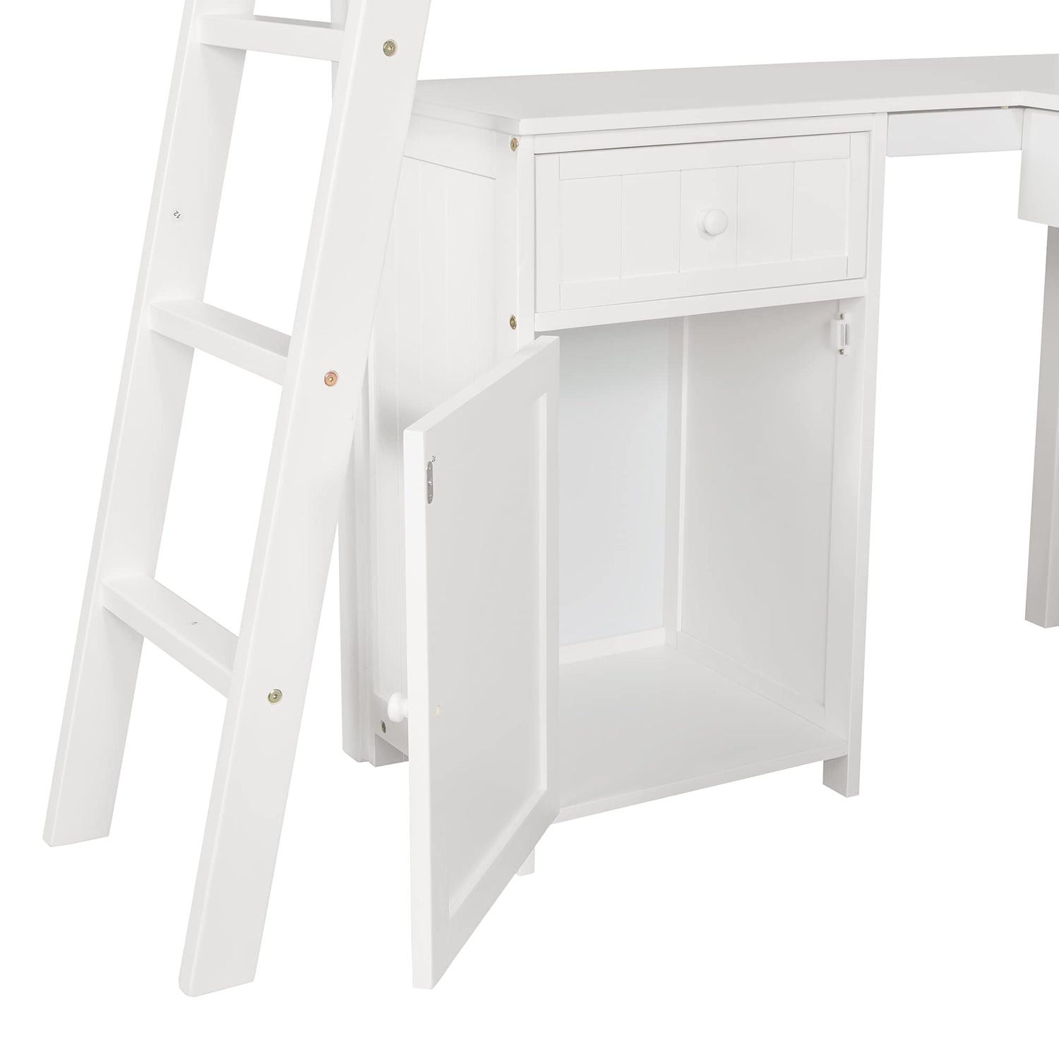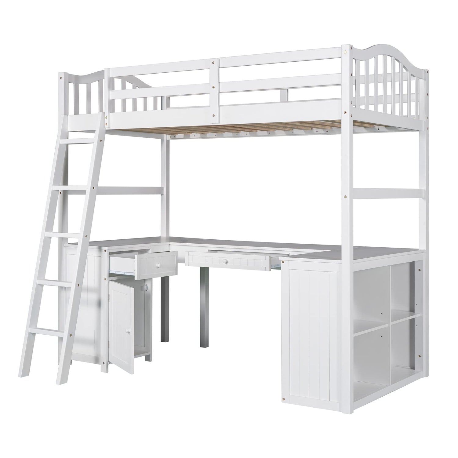 Unlock the possibilities with the Loft Bed with Drawer, Cabinet, Shelves and Desk in twin size, which will have you saving space and maximizing functionality with a wide array of features. Designed with a spacious wooden desk, two drawers, a cabinet and four shelves, your child has a perfect study area while also allowing space to store their belongings. Available in versatile white finish for the perfect fit with your décor.