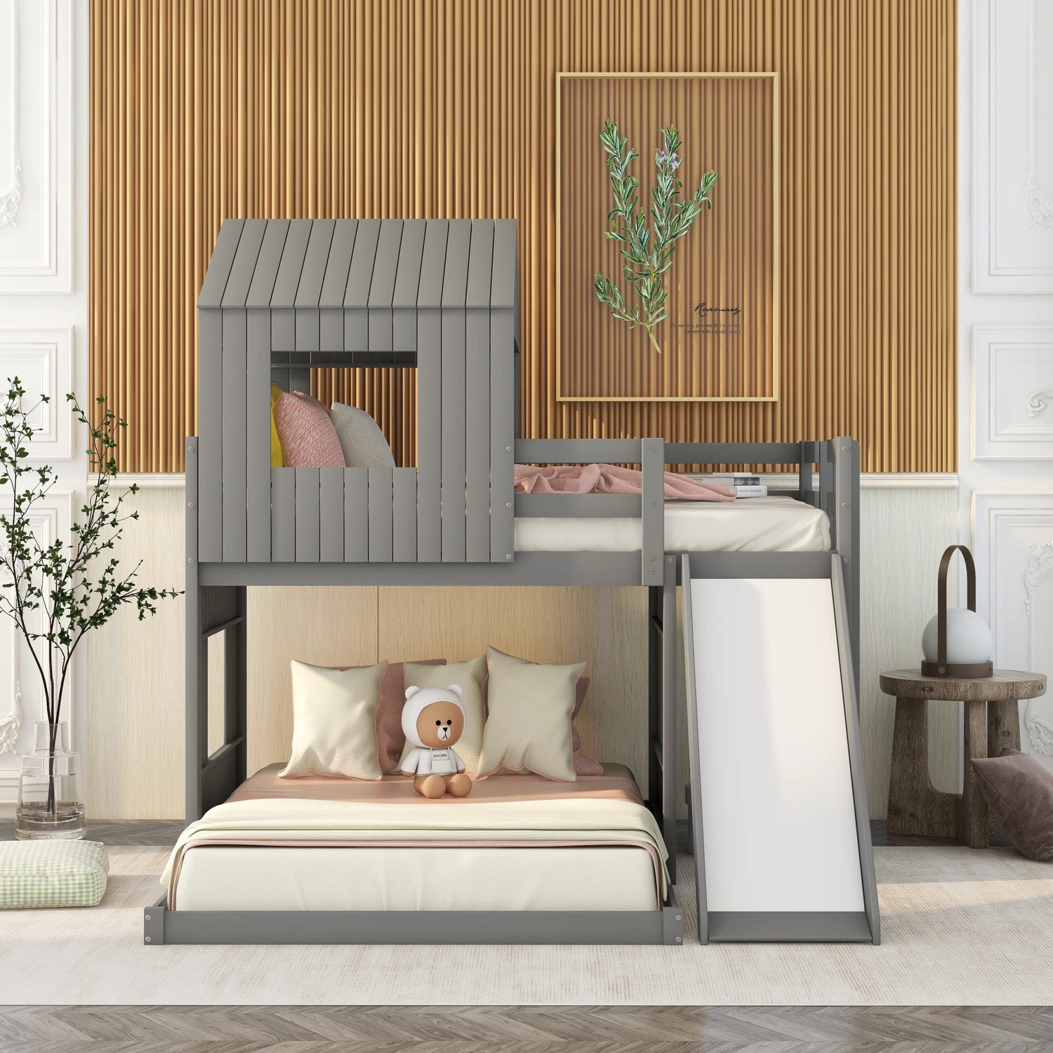 Harper & Bright Designs Grey Twin Over Full House Bunk Bed with Slide, Ladder, and Guardrails