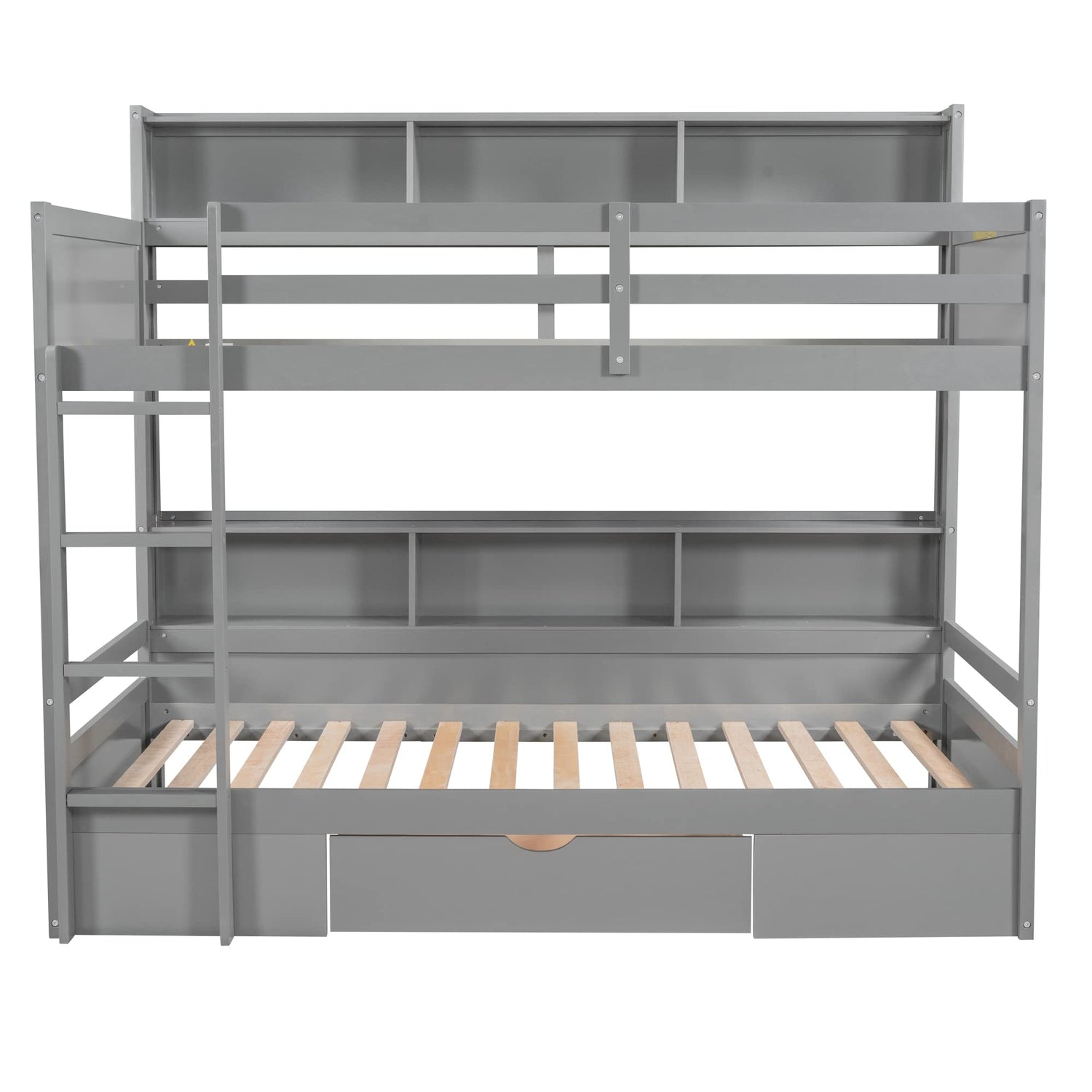Harper & Bright Designs Twin Over Twin Bunk Bed with Storage, Wooden Bunk Bed with Built-in Storage Shelves and Drawer, Kids Bunk Bed Twin Size for Boys & Girls, No Box Spring Needed (Gray)