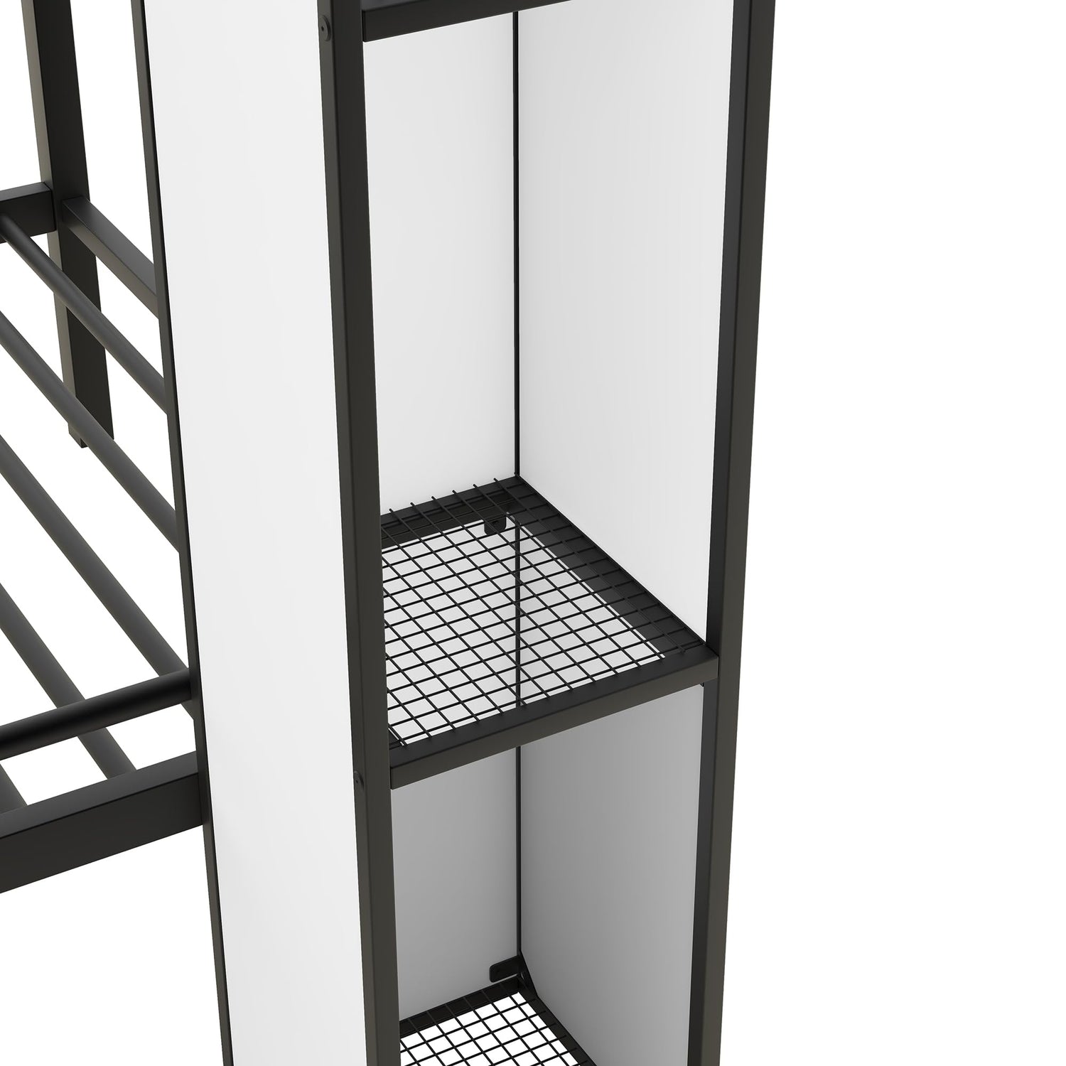 Details: Metal Twin over Twin Castle-shaped Bunk Bed with Wardrobe and Multiple Storage, Black+White