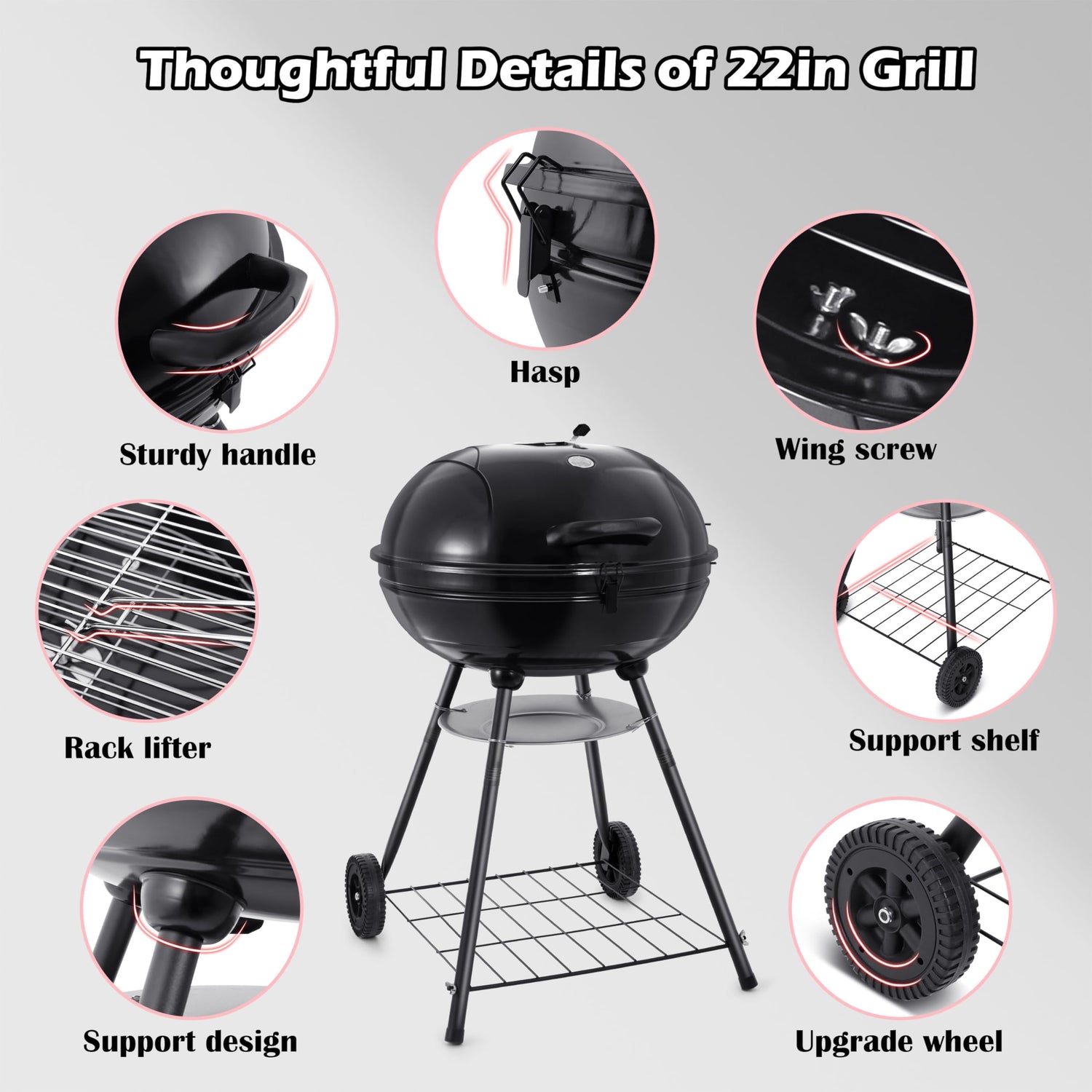 - [Professional Grilling] - Round 22-inch outdoor charcoal grill with a thermometer on the lid for precise real-time temperature monitoring, Perfect for cooking backyard, garden, patio, lawn barbecue, Cook various delicious food at once, like burger, fish, chop, turkey, steak, chicken, sausage, corn, BBQ salad and more, Plus 2 rack lifters to remove grill grate and add new briquettes, and screwdriver to assemble or disassemble it easily