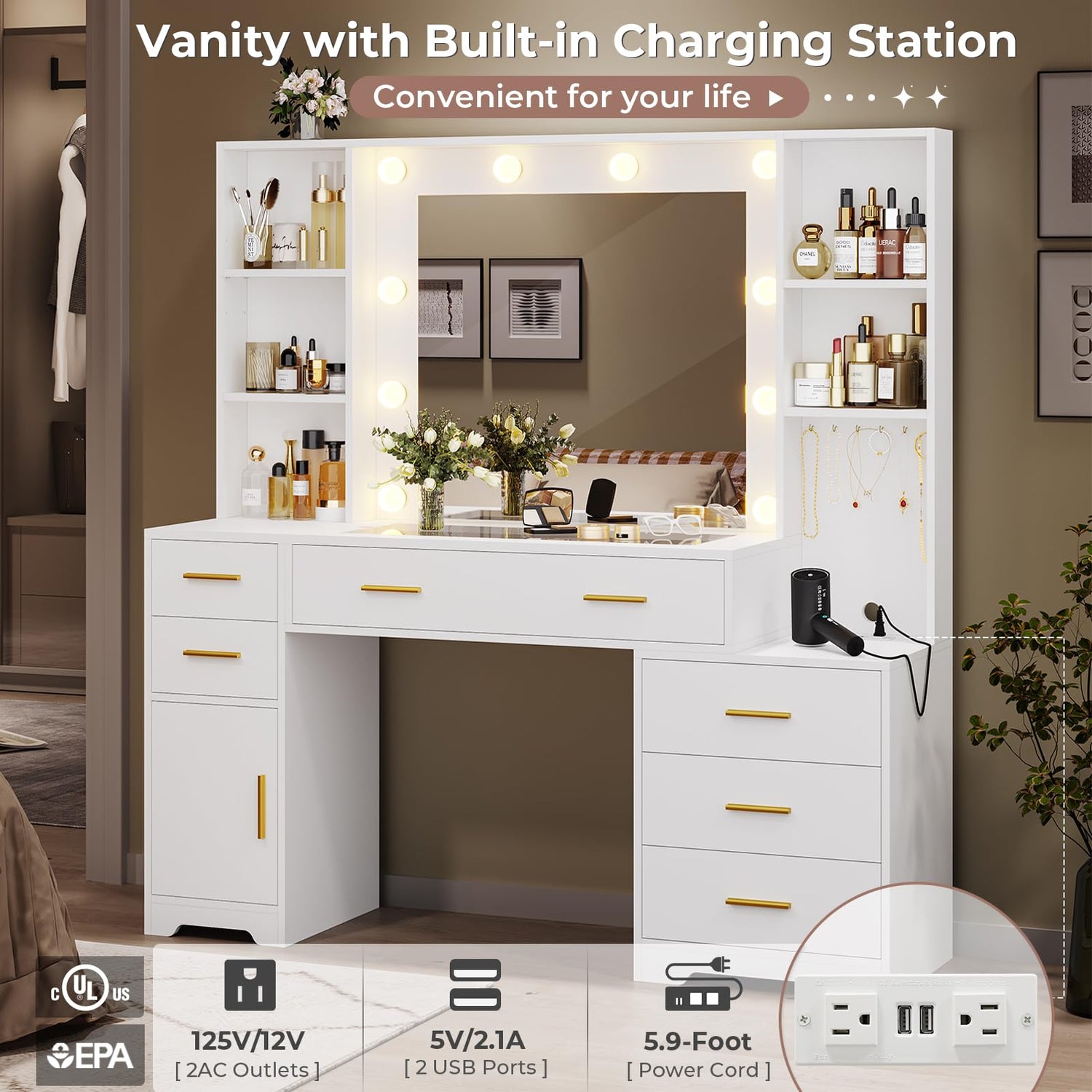 - 【Large Vanity with Ample Storage】48.8'' Large dresser comes with enough capacity storage. The spacious tabletop and 4 shelves are enough to hold your frequently used makeup items, 6 hooks can organize your bracelet or necklace and other tangle-prone items. The dressing table has 6 drawers and 1 side cabinet, which is perfectly able to hold all your stuff, the largest glass top drawer, not only can be used for DIY but also allows you to quickly find the makeup or jewelry you want.