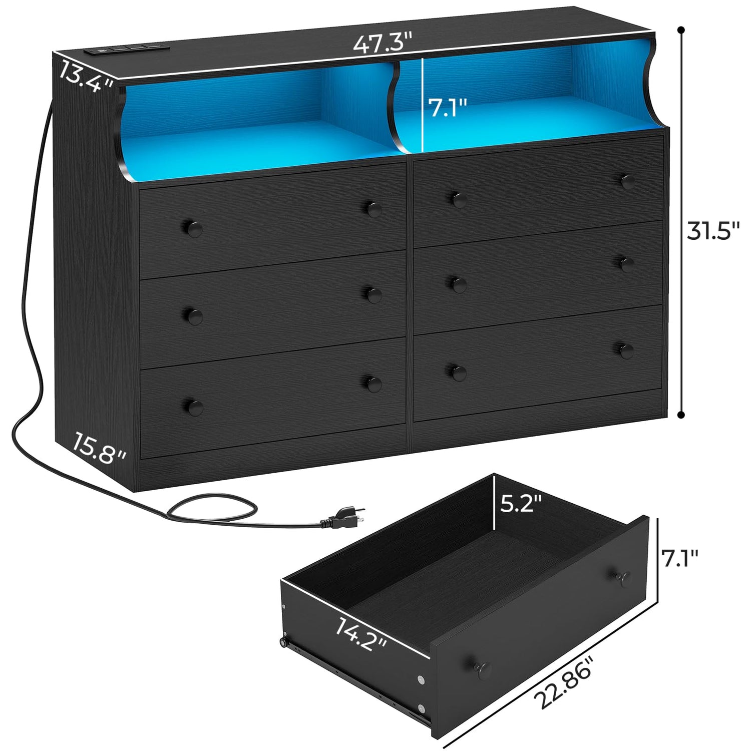 - 【Storage to Get Rid of Clutter】LED wooden drawer dresser has 6 spacious private storage drawers, which can store your clothes, toys, books, or any other personal items. The top layer open storage shelf and large desktop can be used to display or store your frames, vases, books, or other decorations. Making it easier for you to sort and store clutter! Overall measures 47.3" (W) x 15.8" (D) x 31.5" (H).