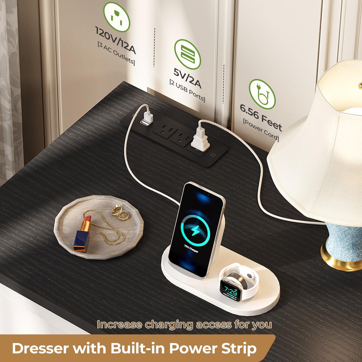 - 【Built-in Power Outlets for Easy Use】This large wooden dresser is equipped with built-in power outlets, including 3 AC outlets and 2 USB ports, which can power your electronic devices such as table lamps, mobile phones, speakers, makeup mirrors, hair dryers, etc. These ports are very convenient to use, especially when your room has limited outlets. It concentrate the wires at the back of the desktop, making it easy to organize, saving space, and keeping the home space beautiful.