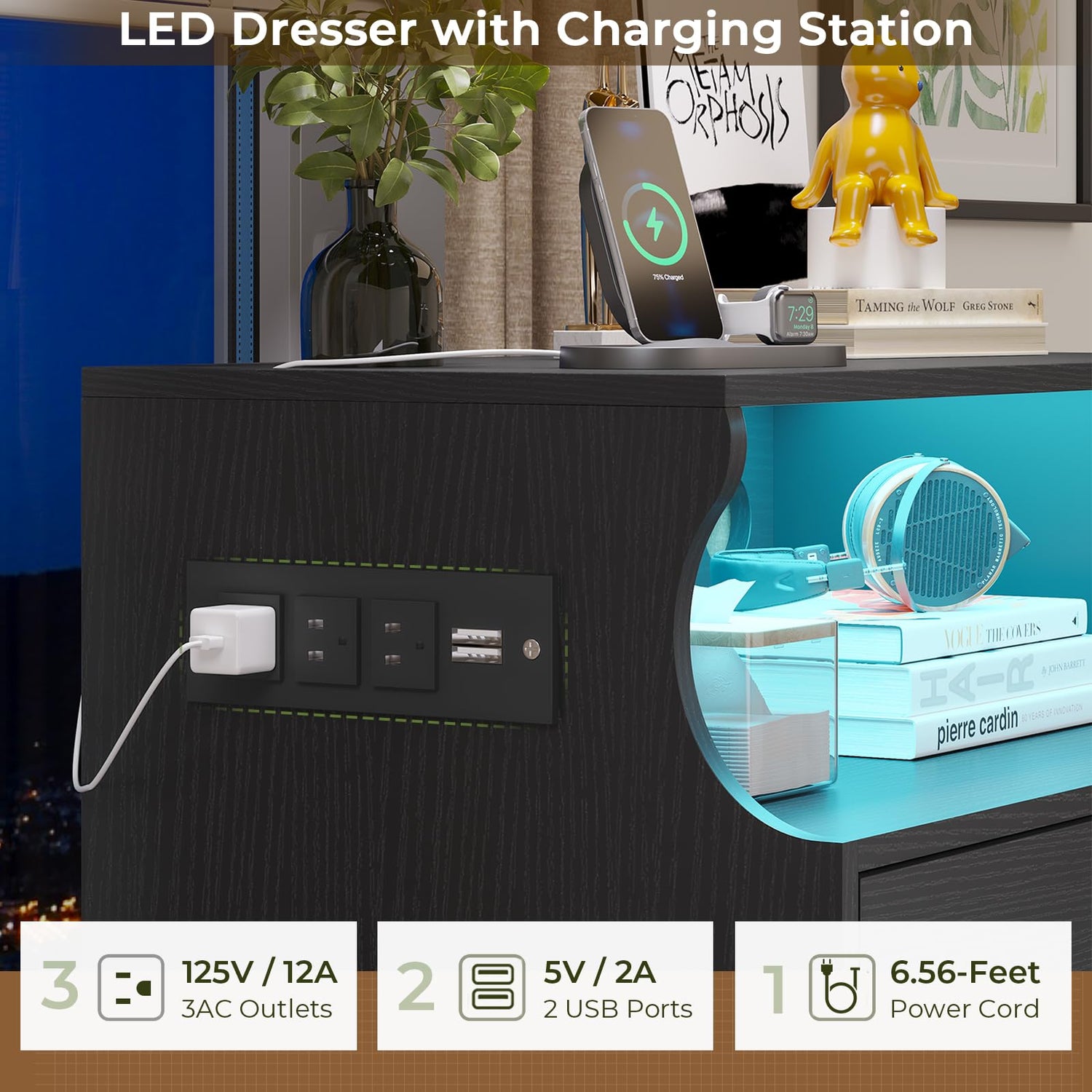 - 【Charging Station and USB Port】Black Dresser is equipped with 3 standard plug outlets and 2 USB ports, as well as a 6.56-foot-long power cord. Enables you to charge mobile devices such as mobile phones, keyboards, headsets, desk lamps and other appliances at any time. Easy to use within your arms' reach.