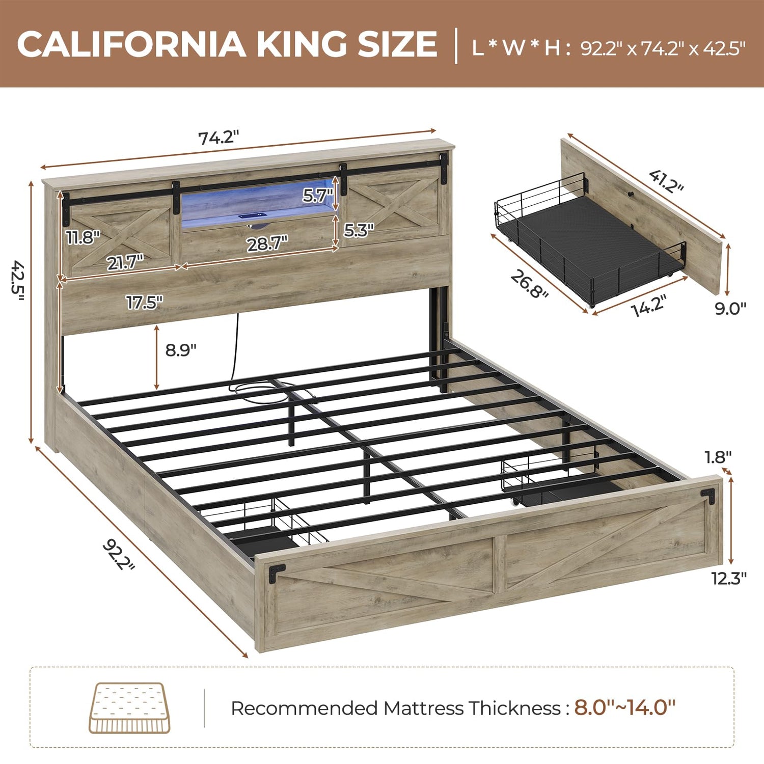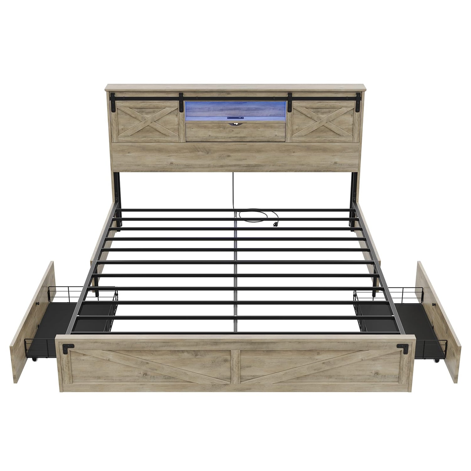 - STORAGE HEADBOARD WITH SLIDING BARN DOOR - The headboard of the bed frame features abundant and varied storage space, The Spacious top of the headboard, 2 storage compartments hidden behind sliding doors, a shelf, and a storage box with door. The perfect combination of rustic aesthetics with abundant storage.