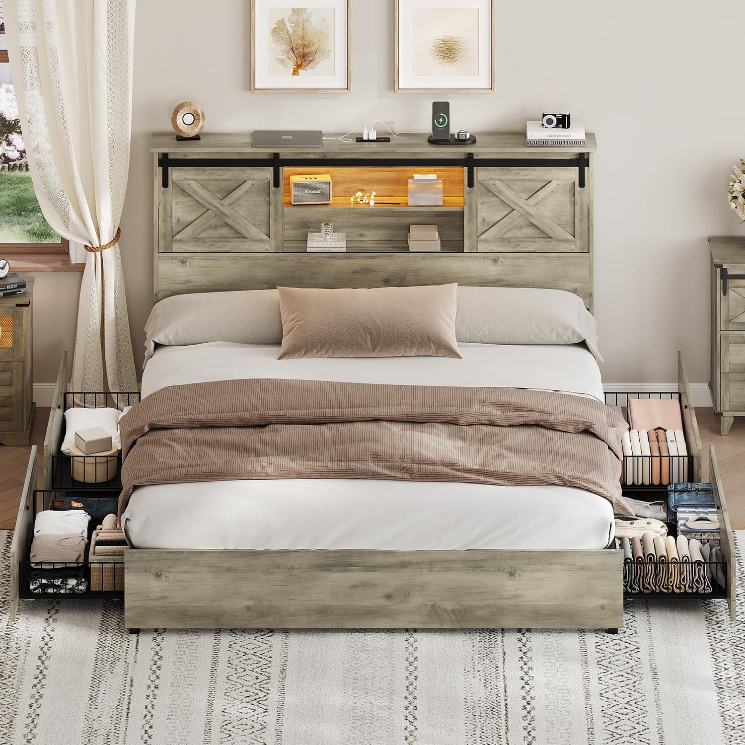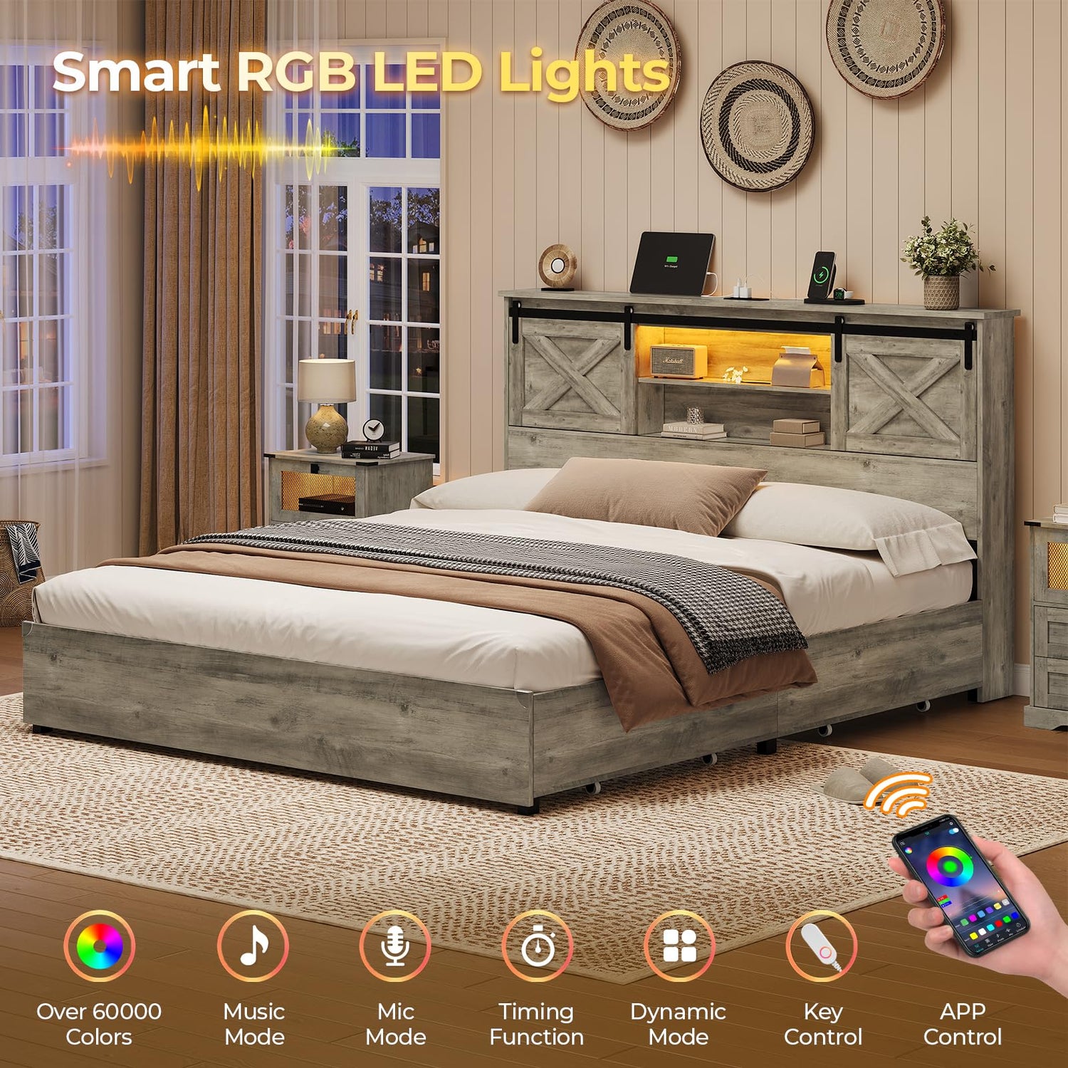 Hasuit Farmhouse Bed Frame King Size with 4 Storage Drawers, Wooden Platform King Beds with Charging Station and LED Lights, Rustic Bed with Storage Headboard and Sliding Barn Door