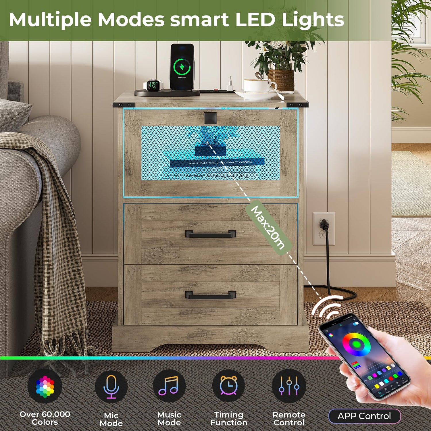 - 【Multiple Modes Smart LED Lights】 The nightstand is equipped with hidden light strips in the open cubby. The LED light with a variety of colors and light patterns to choose from. You can also adjust the light change by APP or key control, In addition to directly adjusting the light in the APP, you can also set the music, voice, and timing modes, to discover more wonderfully!
