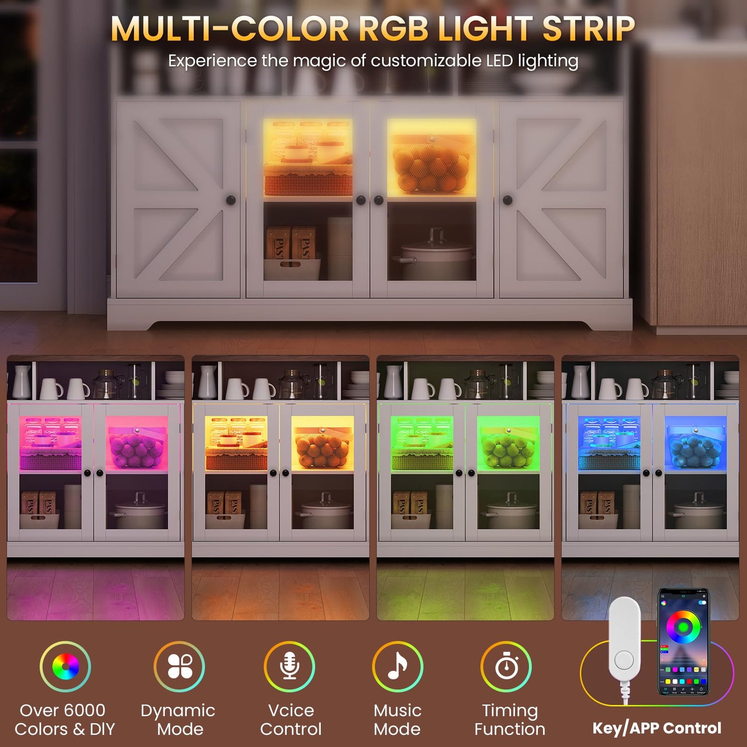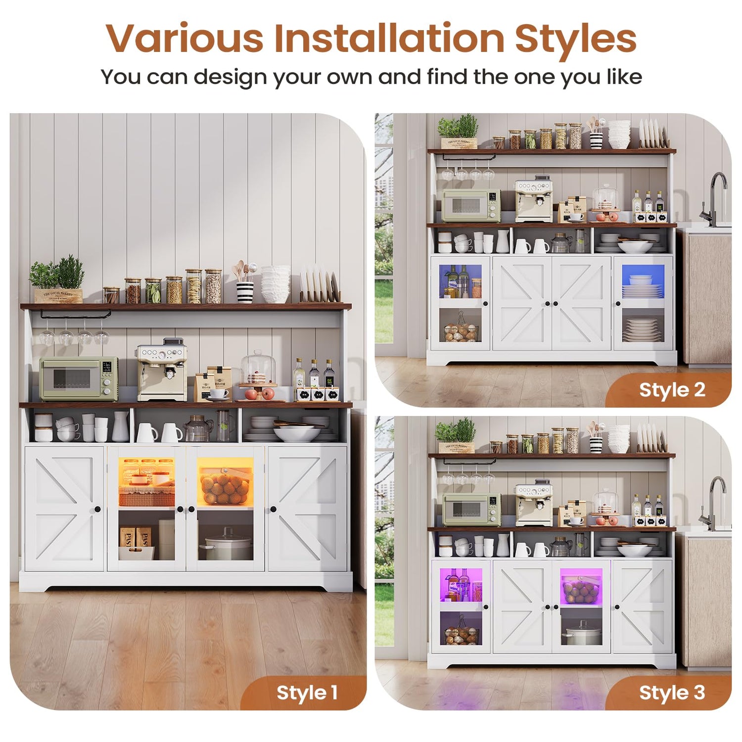 - RGB LED Light:This coffee bar cabinet features a built-in smart RGB LED light strip, controllable via app or remote. Multiple smart modes to create the ideal ambiance. Whether hosting a party with vibrant hues or providing a nightlight for children, this kitchen hutch blends functionality with style