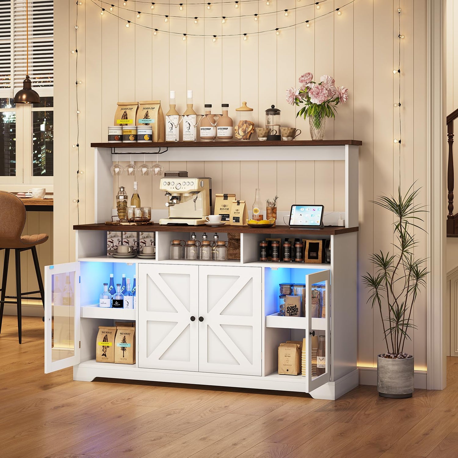 Hasuit Farmhouse Sideboard Buffet Cabinet with Goblet Holder & Power Outlet, Coffee Bar Storage with RGB LED Light and Adjustable Shelf for Kitchen Living Room (White)