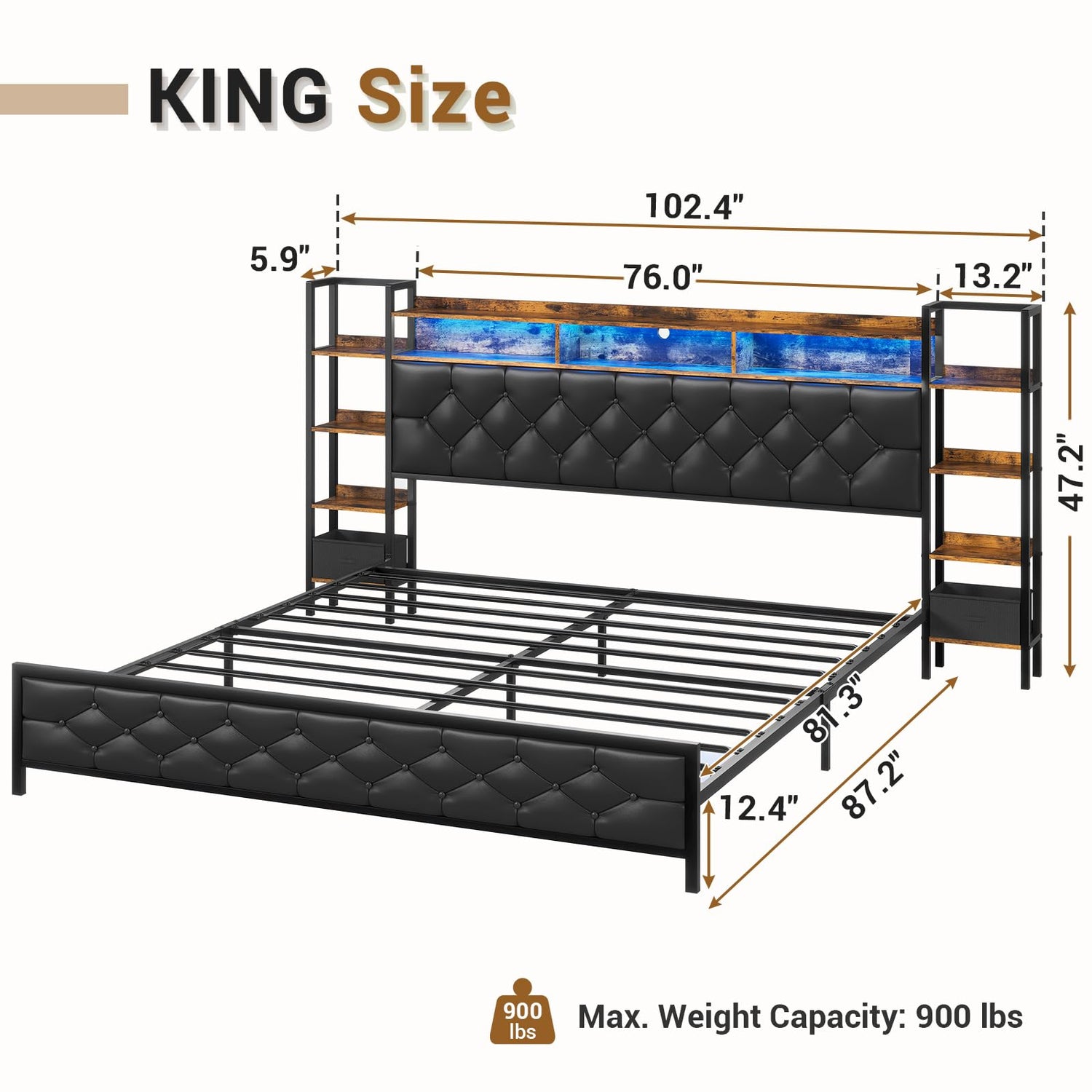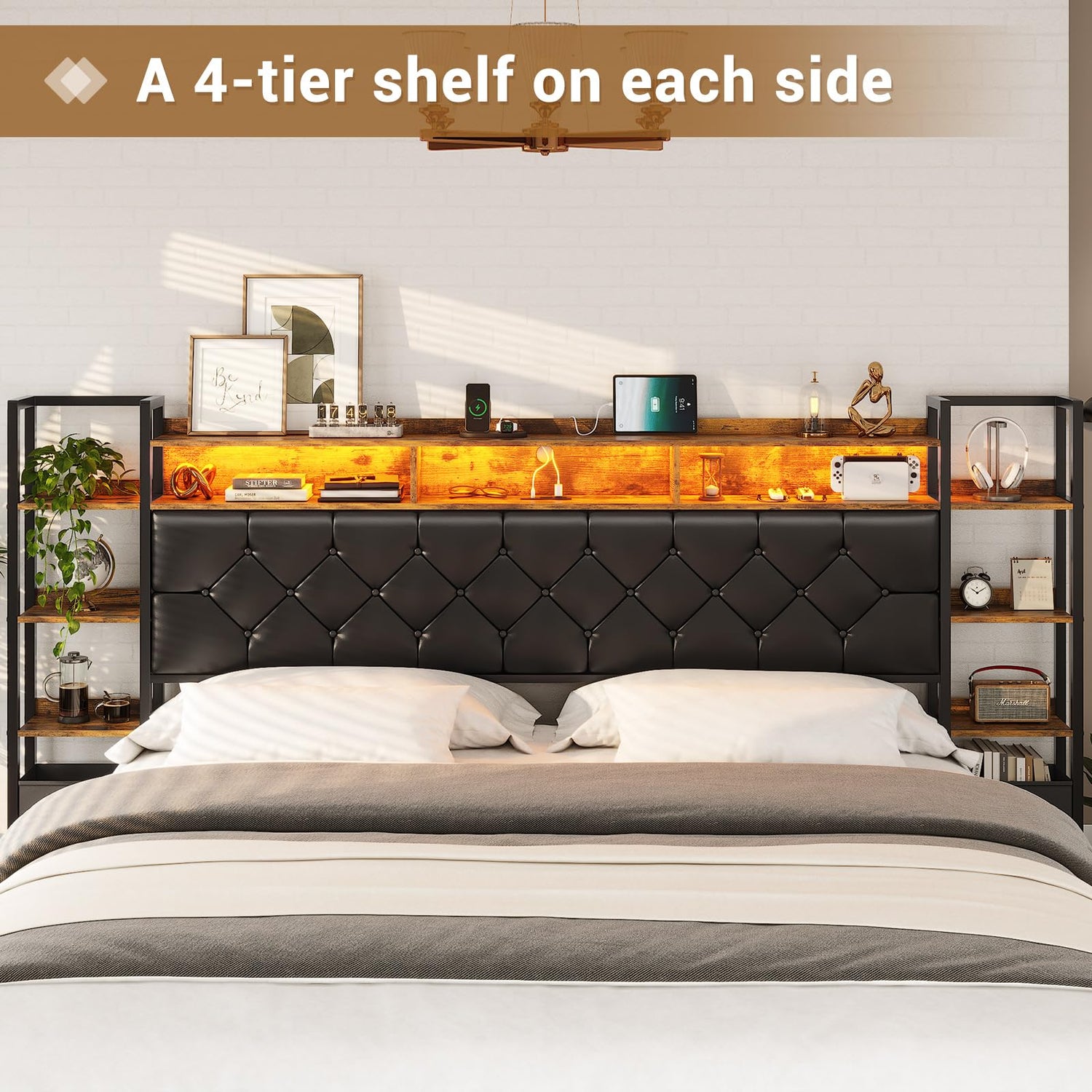 Discover an abundance of storage space with the cleverly designed headboard, featuring a 4-tier shelf on each side. This serves as a practical alternative to traditional nightstands, allowing you to keep your essentials within easy reach. The top of the headboard boasts two additional layers of storage shelves, perfect for organising various items, from books to decorative pieces.