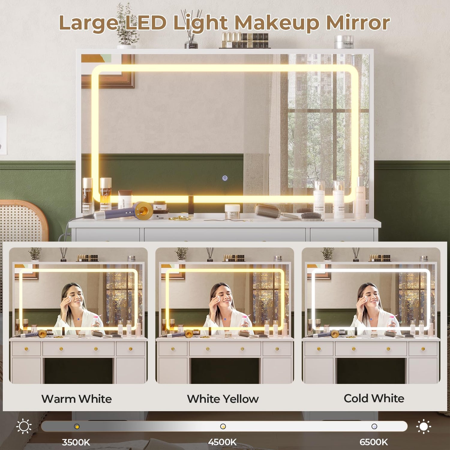 - 【Vanity Desk with Large LED Lighted Mirror】Vanity mirror size:43.3 ''W x 25.6''H. High definition and spacious LED mirror, make it convenient for you to appreciate your makeup or outfit from various angles. 3 different color modes (cool white, natural light, warm yellow), and the brightness of each color of light can be adjusted to meet your needs for use in different environments. This dressing table is perfect as a gift for every girl who loves beauty!