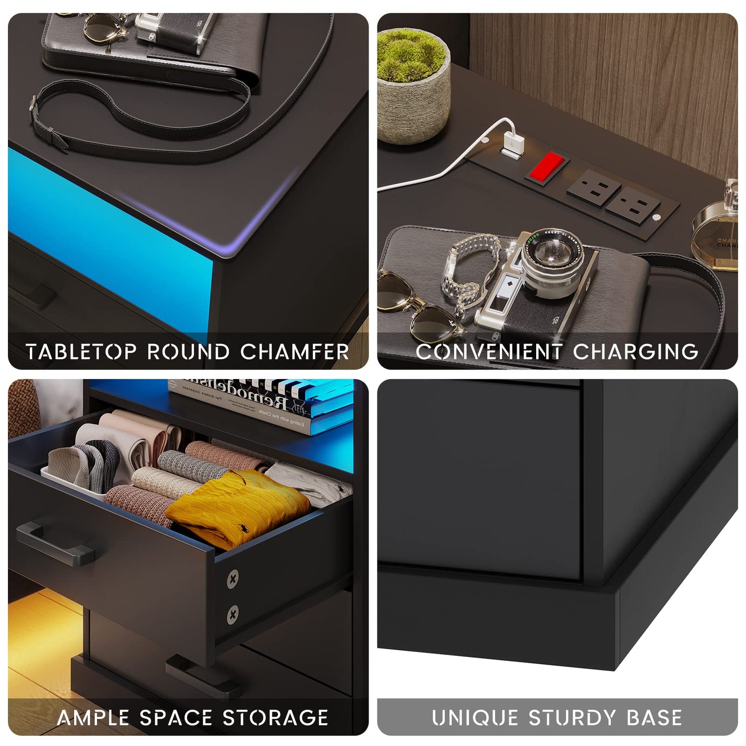 Hasuit Nightstand with Charging Station and LED Lights, Large Bedside Table with 3 Storage Drawer, Black Night Stand for Bedroom, Wider Tabletop 19.0''(L) x 15.0''(W)
