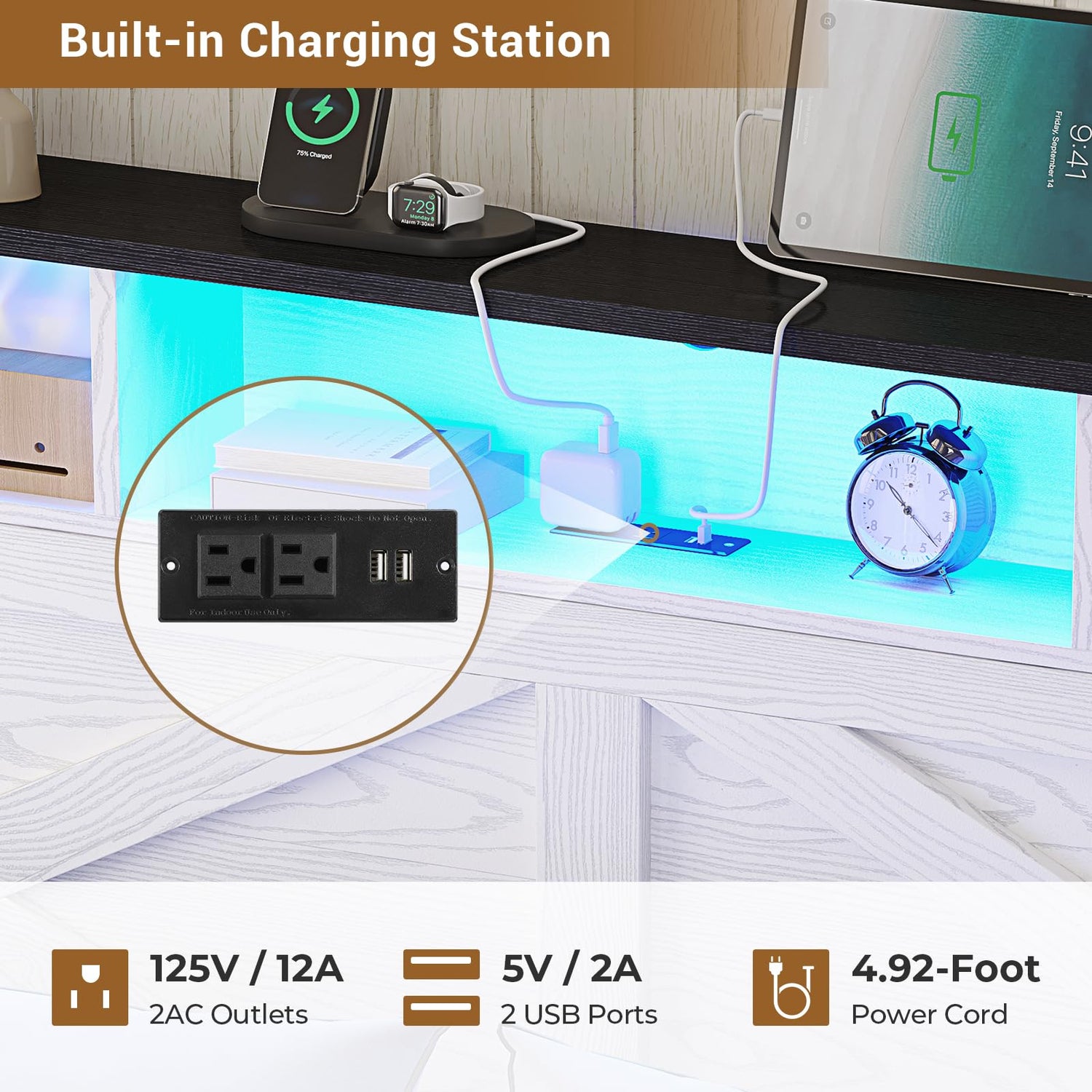 Hasuit Queen Size Bed Frame with Storage Ottoman, Farmhouse Bed Frame with Charging Station and Led Light, Headboard with Storage Rack, Metal Slats, No Noise Design, No Box Spring Needed,Walnut White
