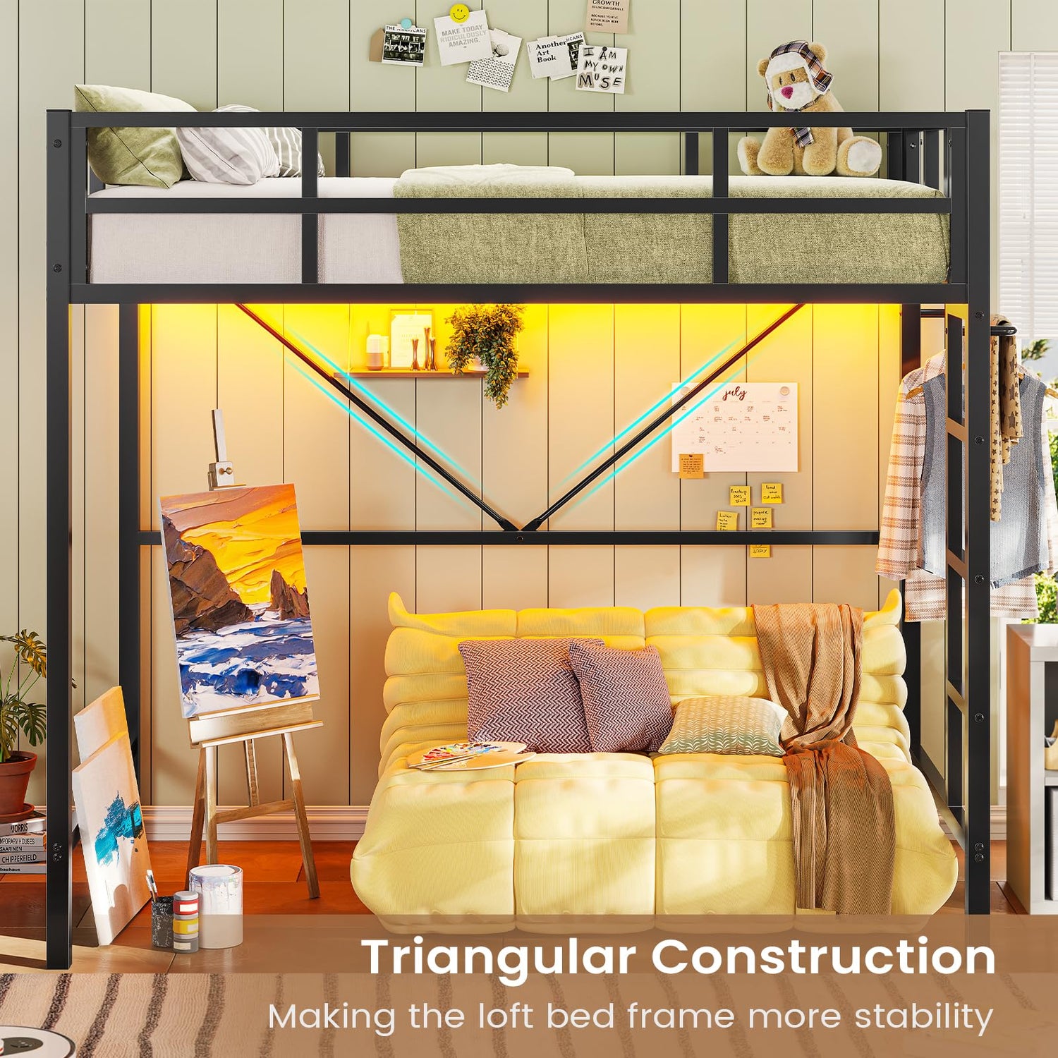 - 【Loft bed with RGB lights】The metal loft bed frame is equipped with RGB LED light strips, which can be controlled by the controller or APP. There are more than 60,000 colors and multiple modes for you to choose. When the voice control mode and music mode are turned on, the color of the LED light will change with the rhythm of the sound and music, adding a sense of atmosphere to your bedroom. You can relax yourself, cheer up, and give yourself a comfortable and relaxing bedroom environment.