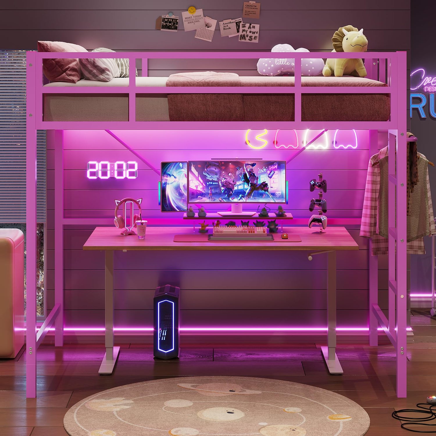 Hasuit Twin Metal Loft Bed with LED Lights, Loft Bed Twin Size with Full-Length Guardrail &Clothes Rack, Heavy Duty Loft Bed Twin Frame, Space-Saving, Noise Free, No Box Spring Needed, Pink