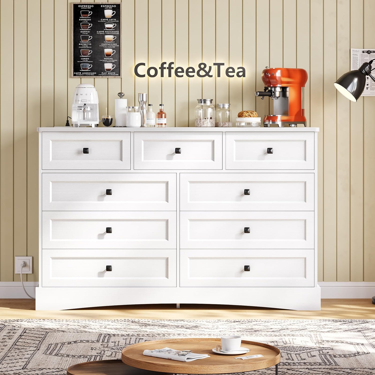 Hasuit White Bedroom Dresser with 9 Drawers, 51.2" Large Drawer Dresser with Charging Station, Wide Farmhouse Dresser Chest of Drawers, Wooden Storage Tower Organizer Dresser for Bedroom, Living Room