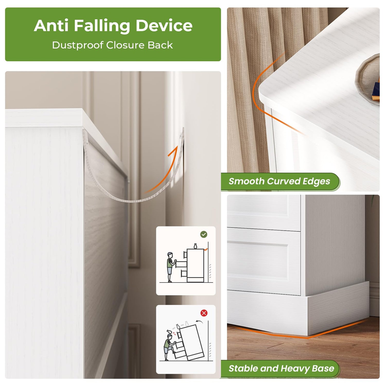 - 【Durable and Stable Tall Dresser】Dressers for bedroom is made of high-quality MDF engineered wood. Hard to both flex or crack. Drawers are equipped with high-quality metal slide rails and handles, which are easy to pull and save effort. The thickened back panel ensures the privacy of your storage while enhancing stability. Anti-tip kit included to keep your family safe.The stable base design made the dresser does not slide easily, provide great durability and stability. With support legs in the middle for added weight support.