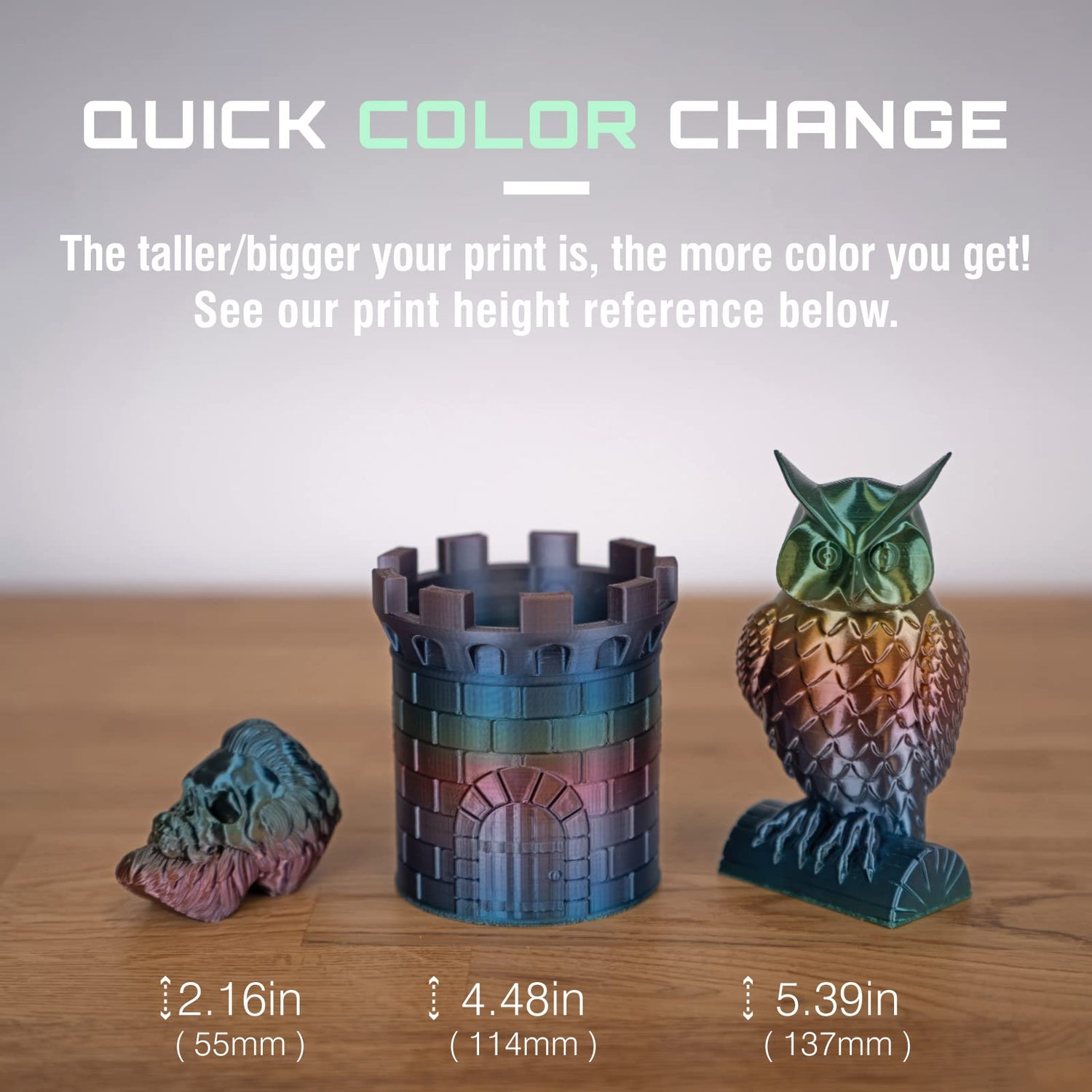 - FAST COLOR CHANGING FILAMENT: Our Rainbow PLA Filament changes colors depending on your print size and infill, allowing for a new color to start every-time you print something new! From decorations to vases, you can print anything you desire with our Multicolored Rainbow PLA Filament! With its high-quality finish and easy to use formula, you’ll be able to unleash your creativity like never before.
