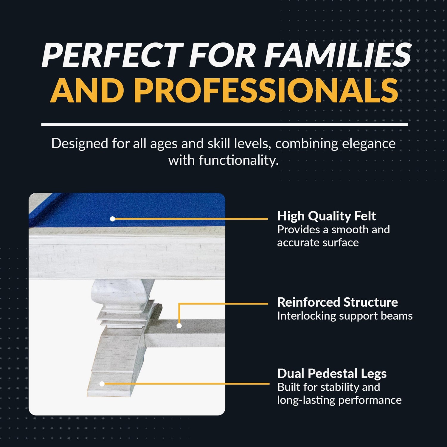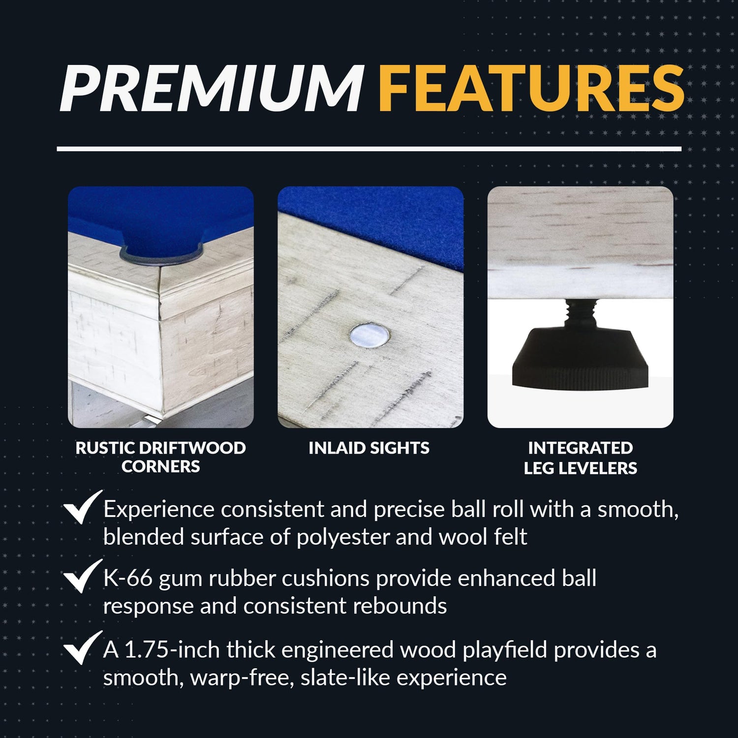 - MODERN FARMHOUSE DESIGN - The 8-ft Montecito Pool Table features a dual-pedestal base and distressed driftwood finish, blending rustic charm with contemporary style. It’s the perfect centerpiece for game rooms, dens, or offices.