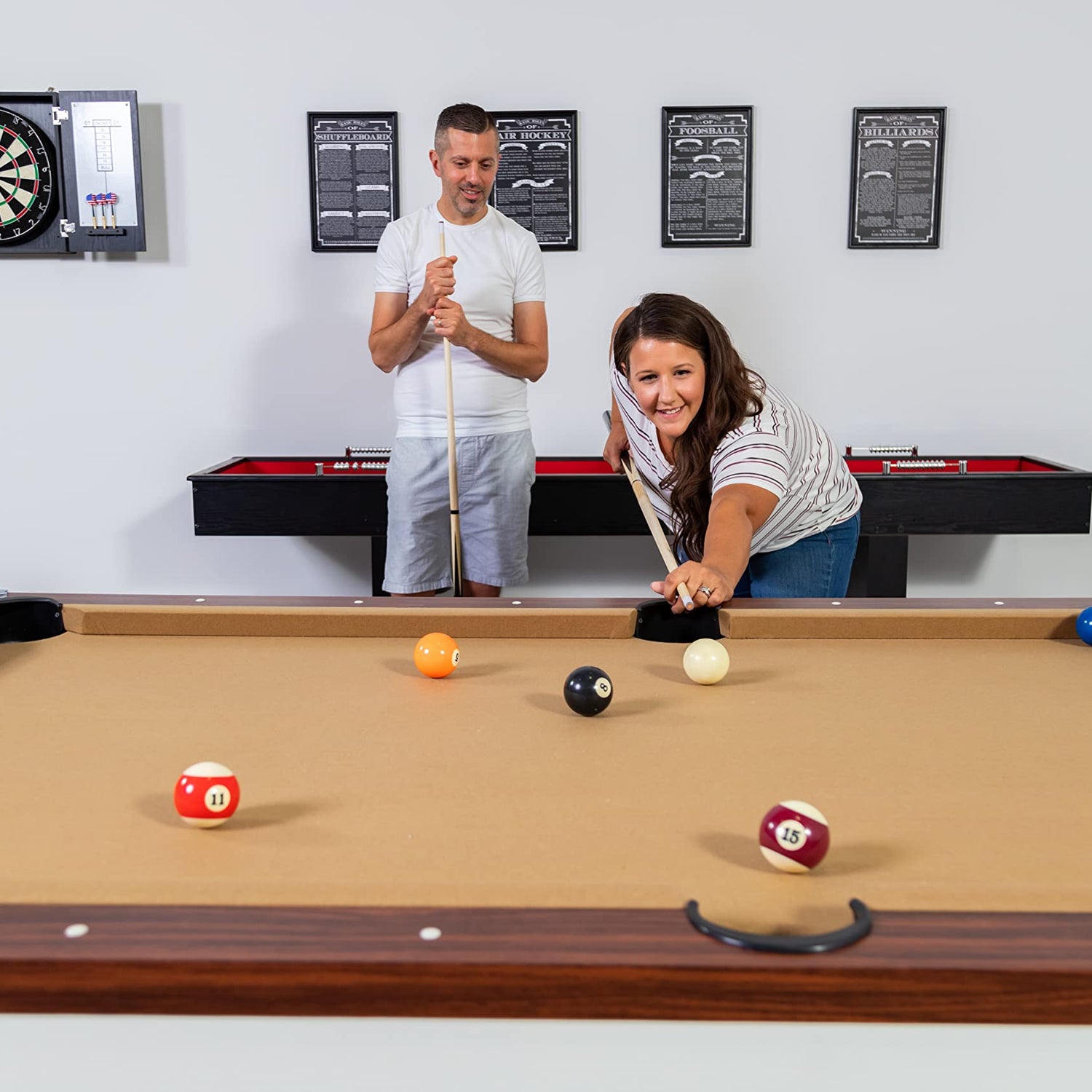 - PREMIUM PERFORMANCE – Balls roll cleanly over a camel-colored wool and polyester felt. High-quality bumpers provide fast, accurate bounce-back. White, inlaid sights add a touch of luxury to this tournament-ready table