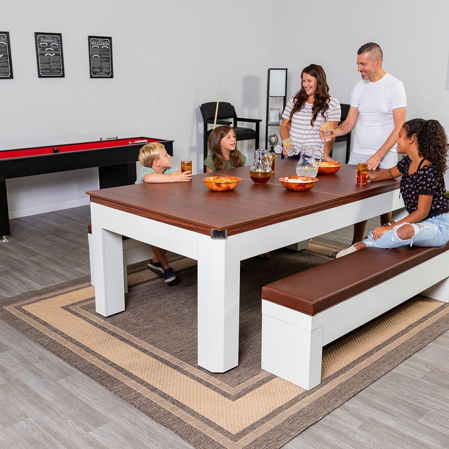 Details: A perfect solution for your game room, rec room, or office. The handsome, multi-functional Newport II 7-ft Pool Table is crafted from sturdy, engineered wood. Featuring crisp, contemporary lines, this rustic-style table is covered in a beautiful two-tone, white and walnut finish melamine. Premium features include 1/2-in round inlayed sights, tournament-tested "True Roll" bumpers, quality nylon/wool blended cloth and chrome-plated corner caps. This high-quality pool table easily converts to table tennis or dining, thanks to a convenient, 2-piece top. Matching benches with soft, padded seat cushions provide a luxurious place to take a break. Each bench features built-in storage, providing a handy place to store your game accessories. 180-day limited warranty.