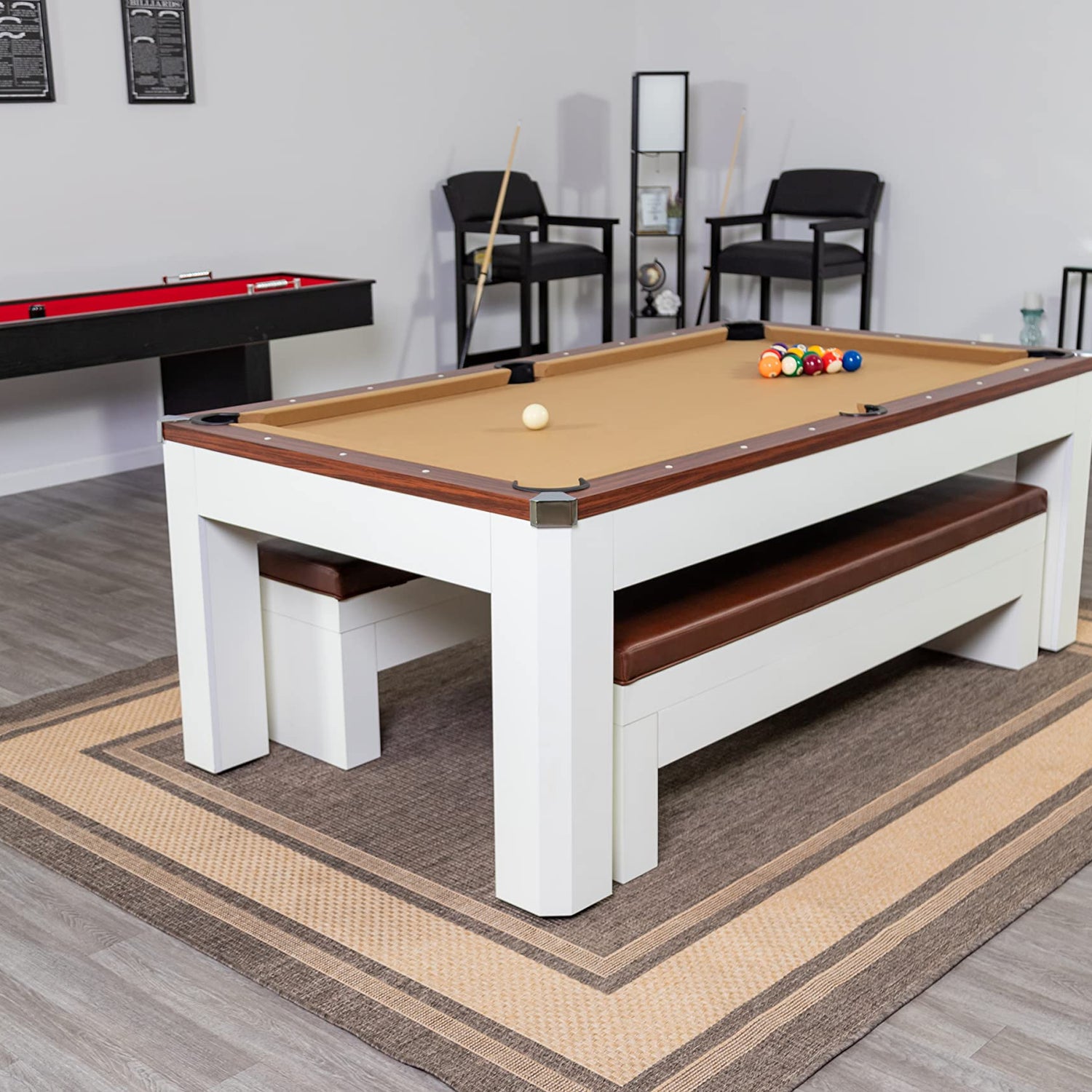Hathaway Newport 7-ft Pool Table Tennis Combination with Dining Top, Two STO Newport II 7-ft Pool Table Combo Set with Benches - White with Camel Feltrage Benches with Accessories - Walnut