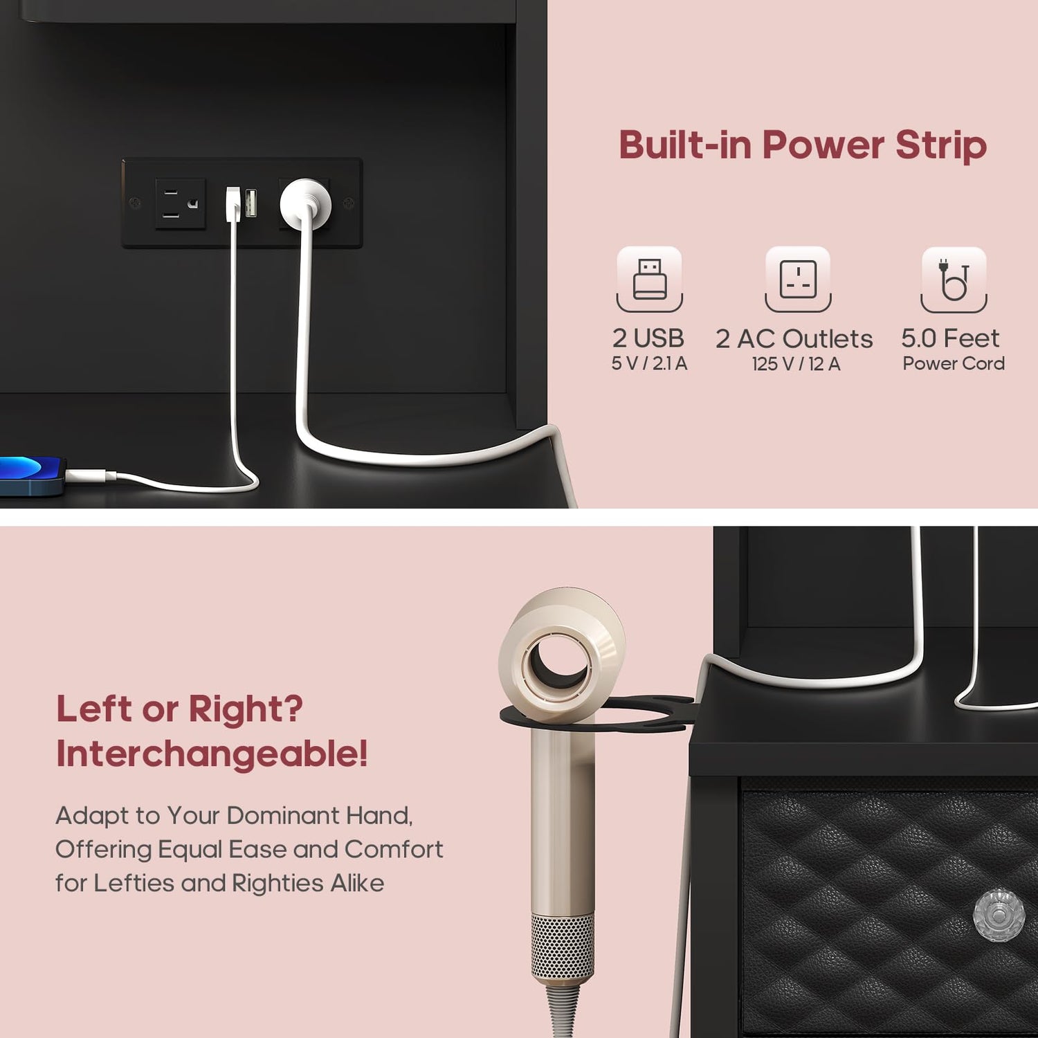 - Built-In Power Outlet: The integrated power outlet of the vanity keeps your styling tools within reach, eliminating messy cords and making your beauty routine more efficient and enjoyable