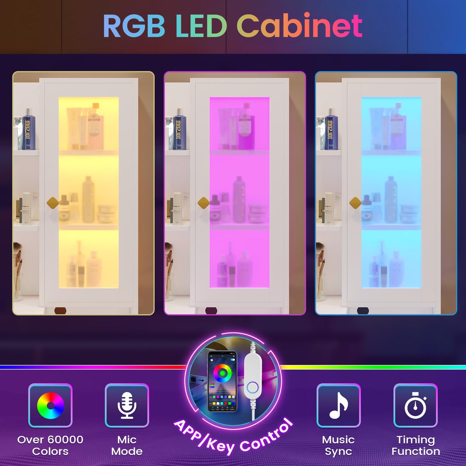 - 【Glass Cabinet Door with RGB lights】-This vanity is equipped with a glass cabinet door and an RGB lighting system, which can be controlled via APP or a switch. With over 60,000 static colors available and multiple lighting modes, the system can synchronize to music for a stunning visual experience while you relax or entertain.