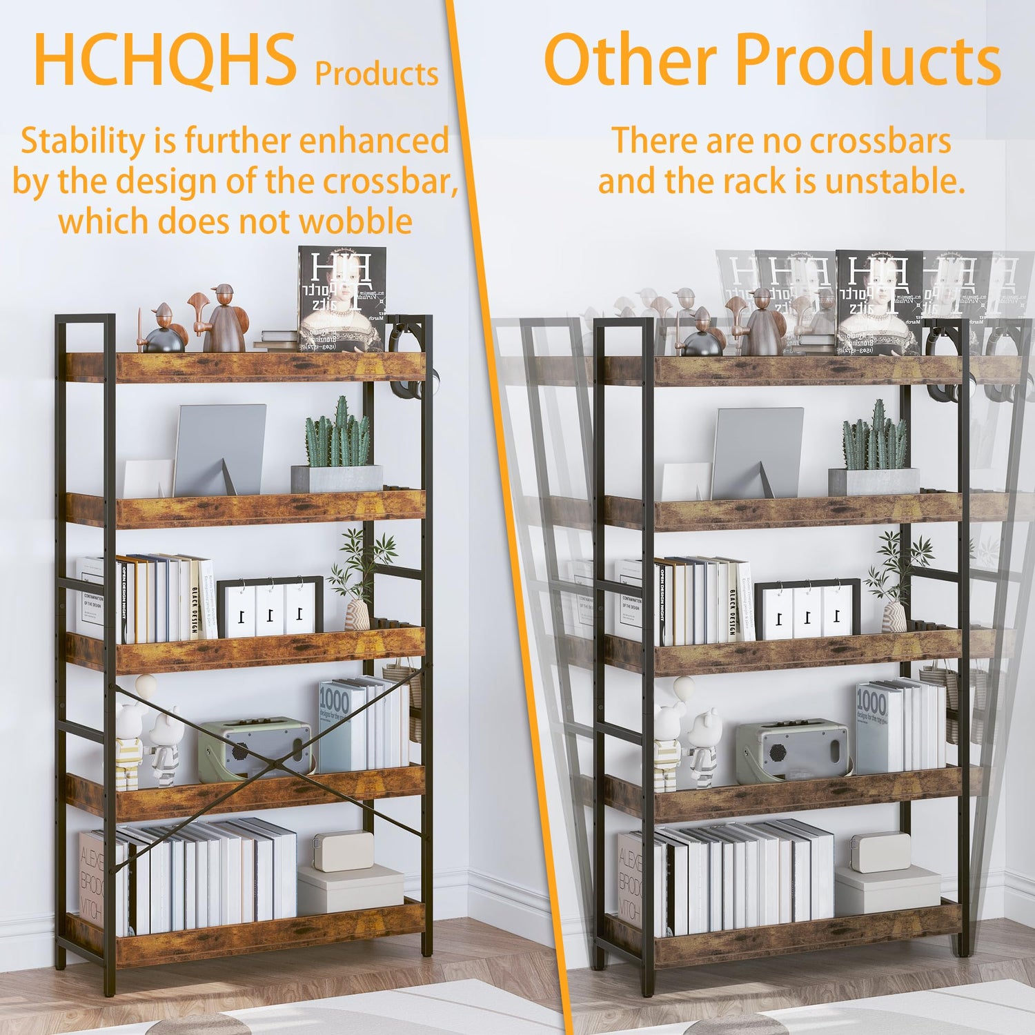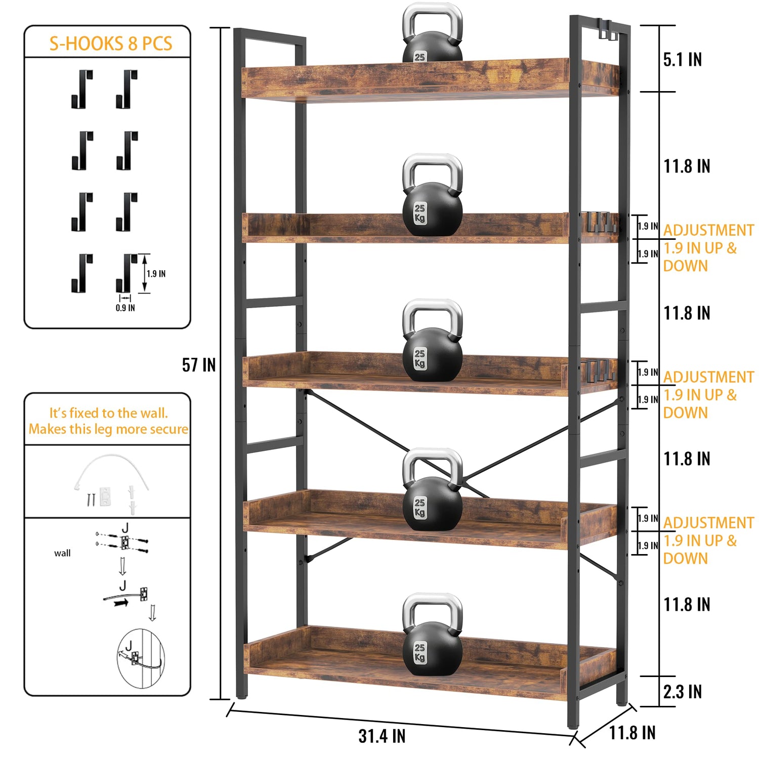 - 【8 Storage Hooks & Anti-Falling】The 5 tier bookshelf have different iron frame designs on each side, providing versatile storage options for products of various heights including books and ornaments. Additionally, 8 multipurpose hooks are included to hang headphones, toys, or other small decor.