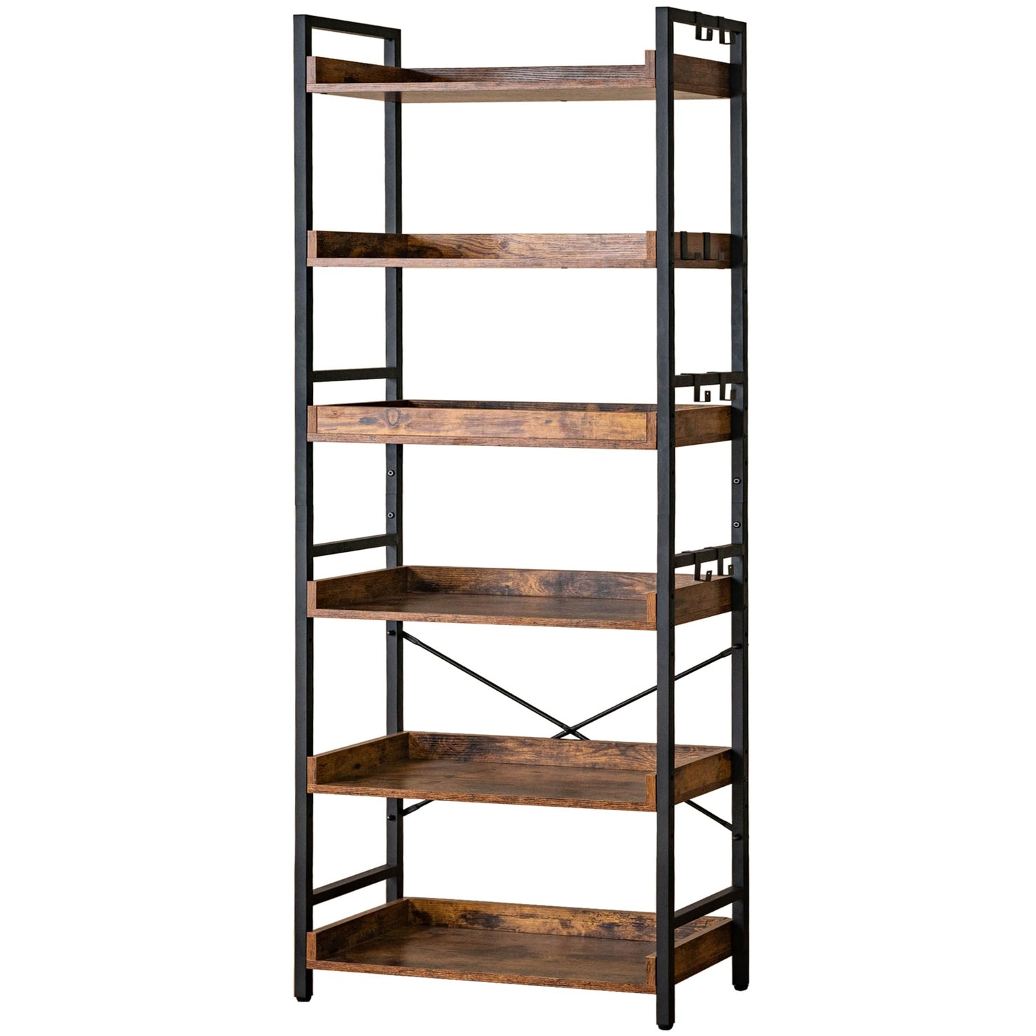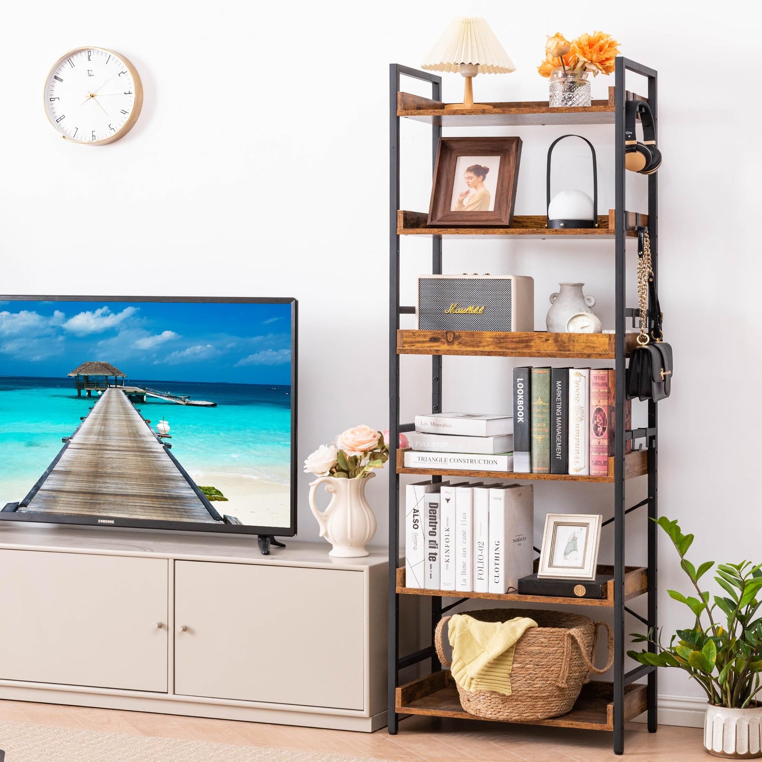 - 【8 Storage Hooks & Anti-Falling】The 5 tier bookshelf have different iron frame designs on each side, providing versatile storage options for products of various heights including books and ornaments. Additionally, 8 multipurpose hooks are included to hang headphones, toys, or other small decor.