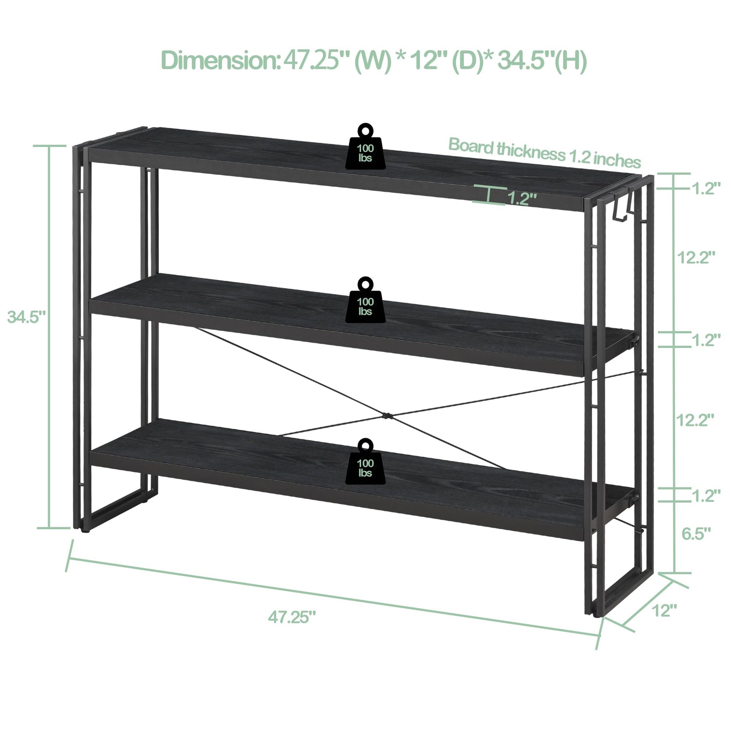 - Dimensions: The shelf measures 47"W x 12"D x 33.5"H, with a height of 12.2 inches between shelves, providing ample space to organize your photo albums, home and office decor, wine, books, and food, among others.