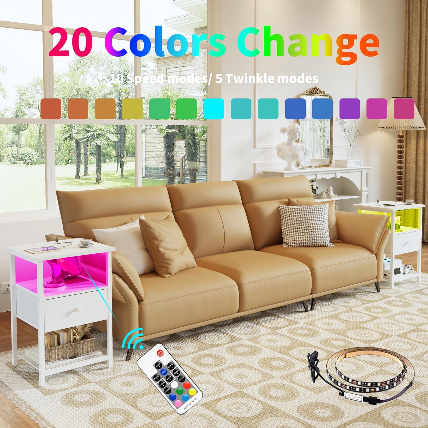 - đăLED Nightstands set of 2 with Variety of RGB Color LED LightsăThe light color, brightness and strobe mode of the LED nightstand can be adjusted at will according to the needs of the scene. Soft and colorful lighting design of the bedside table set of 2 brings a warm and stylish dreamy atmosphere to your bedroom and living room.