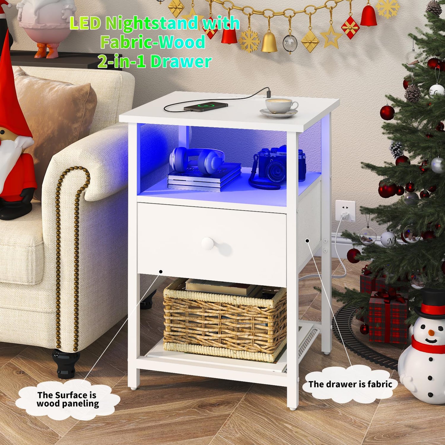 HDDDZSW LED Nightstands set of 2 with Charging Station, Bedside Tables with USB Ports and Outlets, End Table with Fabric-Wood 2-in-1 Drawer for Small Spaces, White Side Table for Bedroom, Living Room