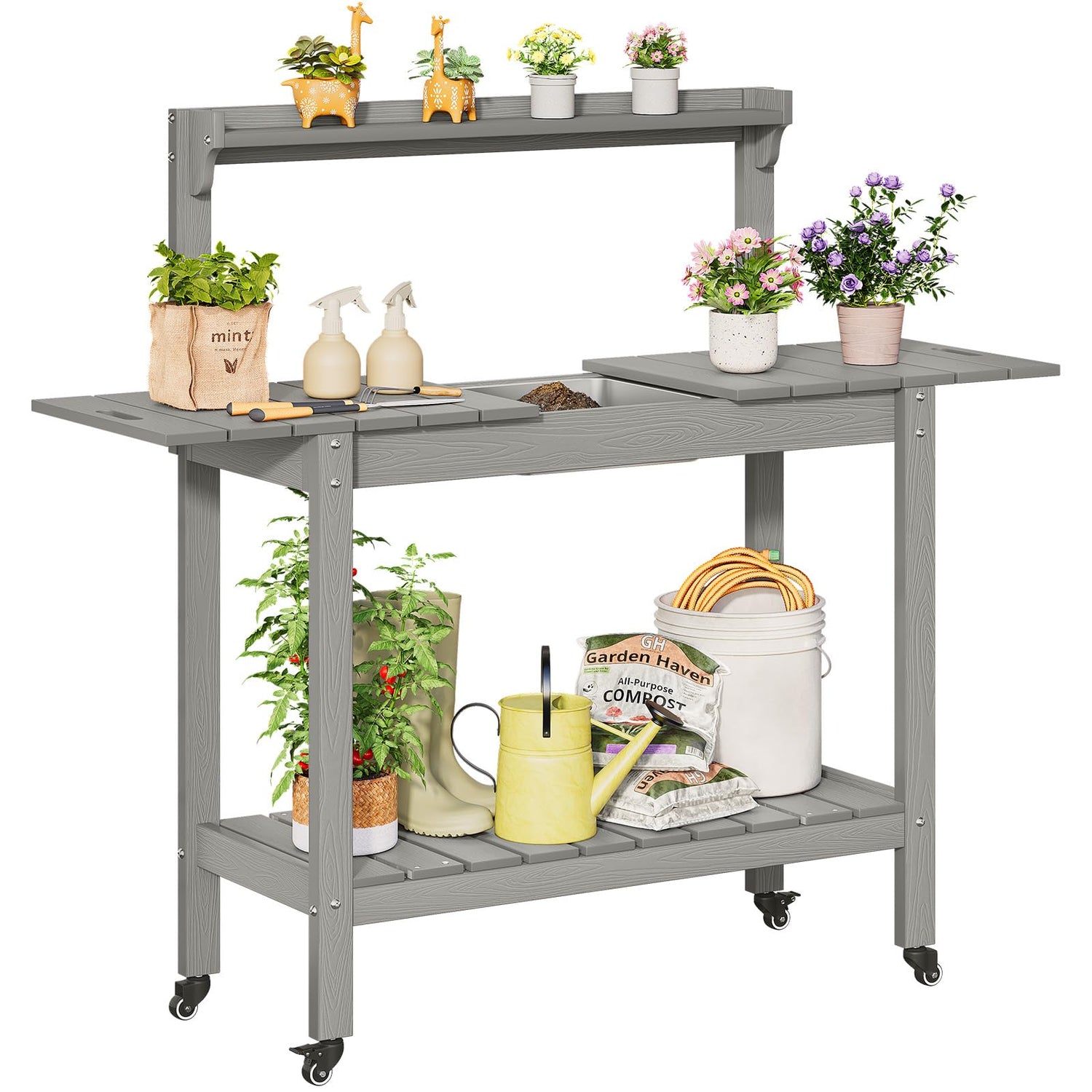 HDPS Outdoor Potting Bench with Sliding Tabletop/ 4 Wheels/Removable Sink, All-Weather Outside Garden Work Table, No Rust/Fade/Break, Potting Station for Porch, Patio & Backyard (Grey)