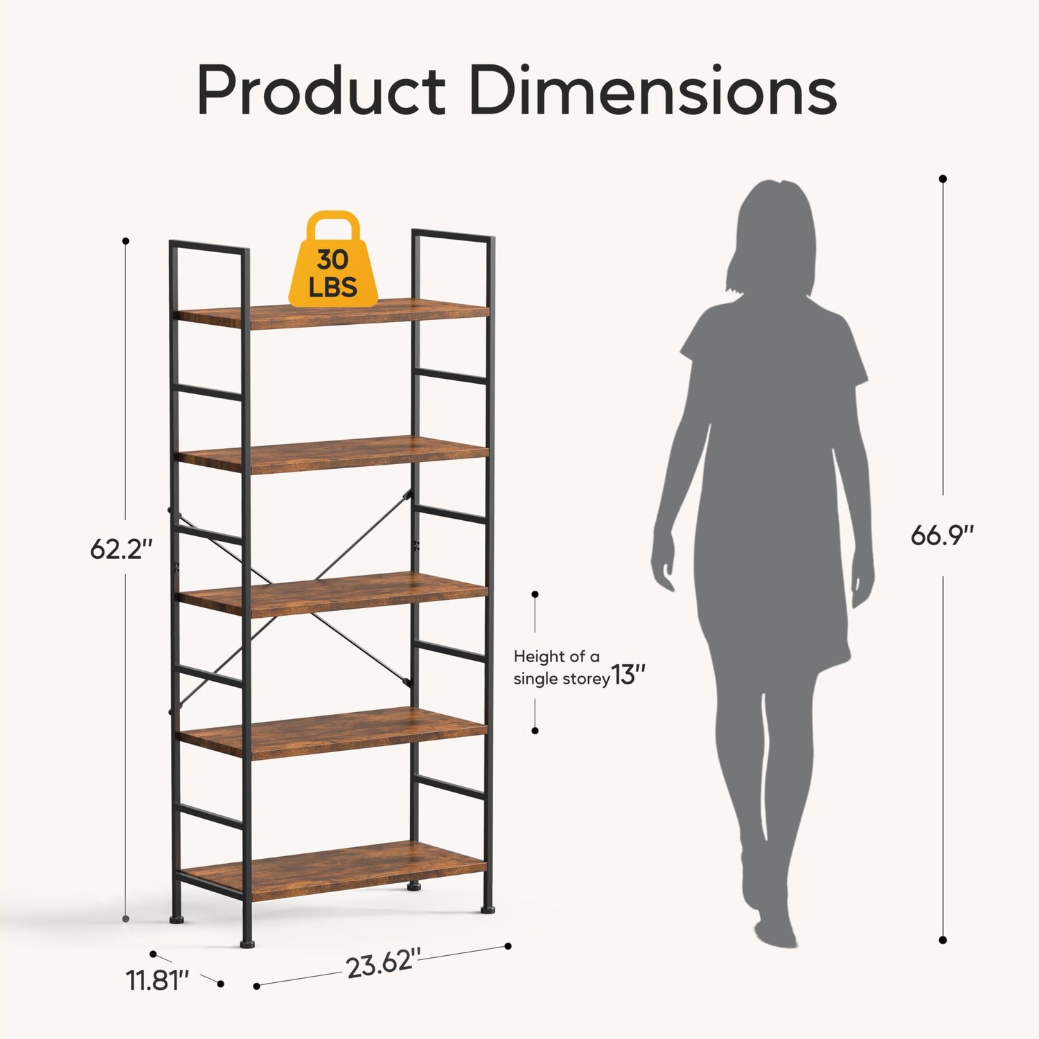 - Easy to Assemble: Bookshelf 5 tier overall dimension is 23.62"L x 11.81" W x 62.2"H. Manual with detailed operation instructions, the hardware and tools included and each accessory is labeled for easy installation