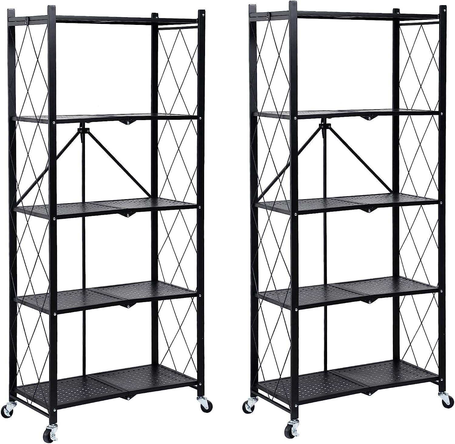 HealSmart Heavy Duty 5-Tier Foldable Metal Rack, 27.95" D x 14.96" W x 63.78" H Storage Shelving Unit 1250 lbs with Wheels Moving Organizer Shelves for Garage Kitchen, Black, 2 Pack