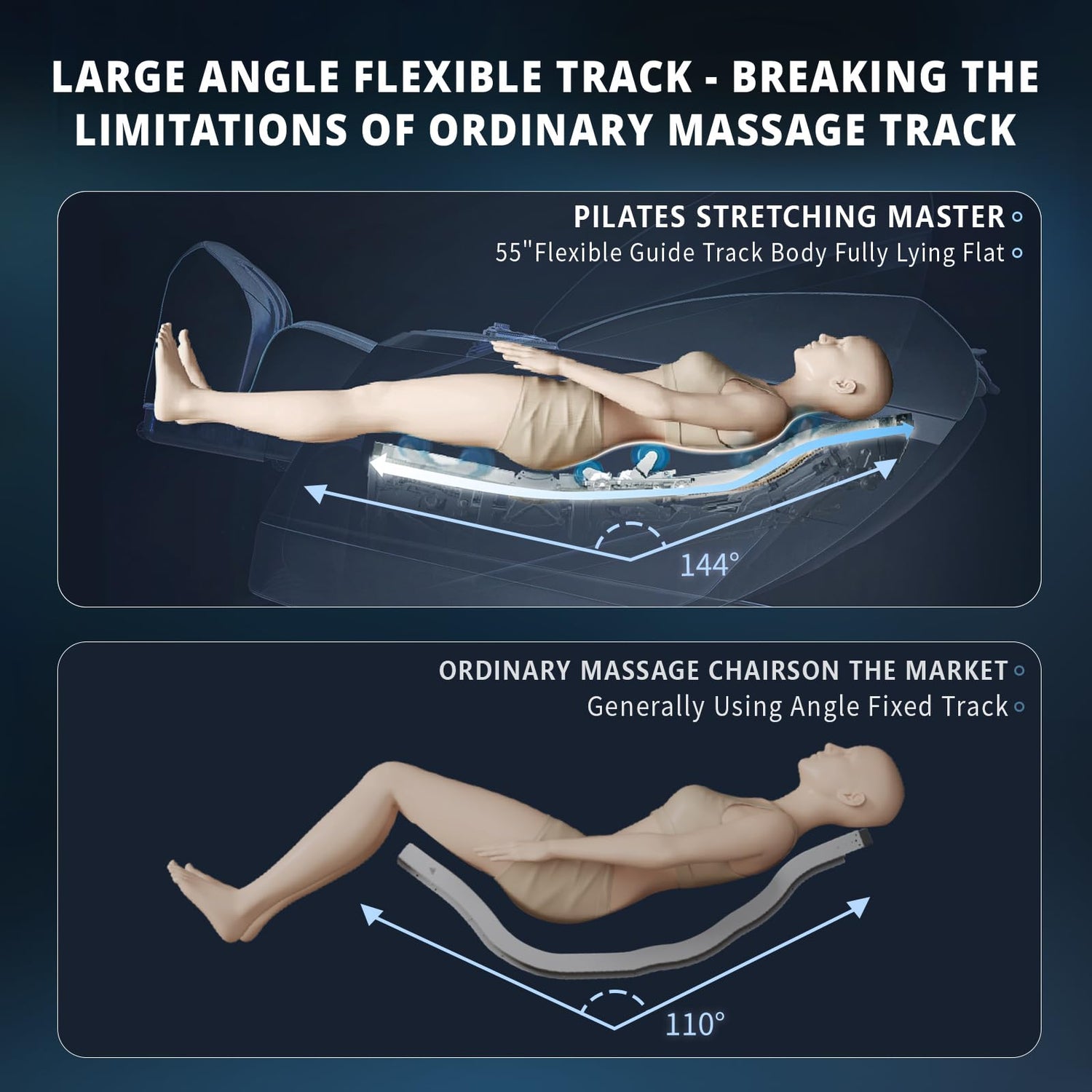 - 【166° Flexible Track】Traditional SL-shaped tracks have a fixed angle (usually 110°) between the backrest and seat,It cannot achieve true lying flat.But our massage chair have Flexible Track,and the angle between the backrest and seat tracks can be opened from the initial 110° to an additional 56°, resulting in a total angle of 166° when fully opened. This adjustment allows for a more reclined position, closer to lying flat, providing a more stretched and comfortable posture. Paired with a 4D massage mechanism, it effectively performs Thai-style stretching by arching the back, delivering a truly relaxing experience.