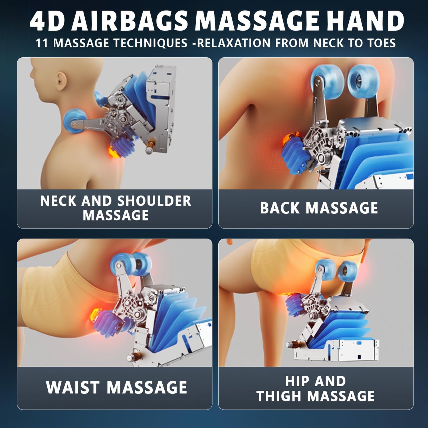 - 【4D Advanced Massage Hands】 Immerse yourself in a world of ultimate relaxation with our massage chair’s advanced 4D massage mechanism. Unlike traditional massage chairs, our 4D technology allows for multidimensional movements, closely simulating the techniques of professional masseuses. Feel the tension melt away as the massage rollers adjust their intensity and depth, offering a personalized massage experience tailored to your preferences.