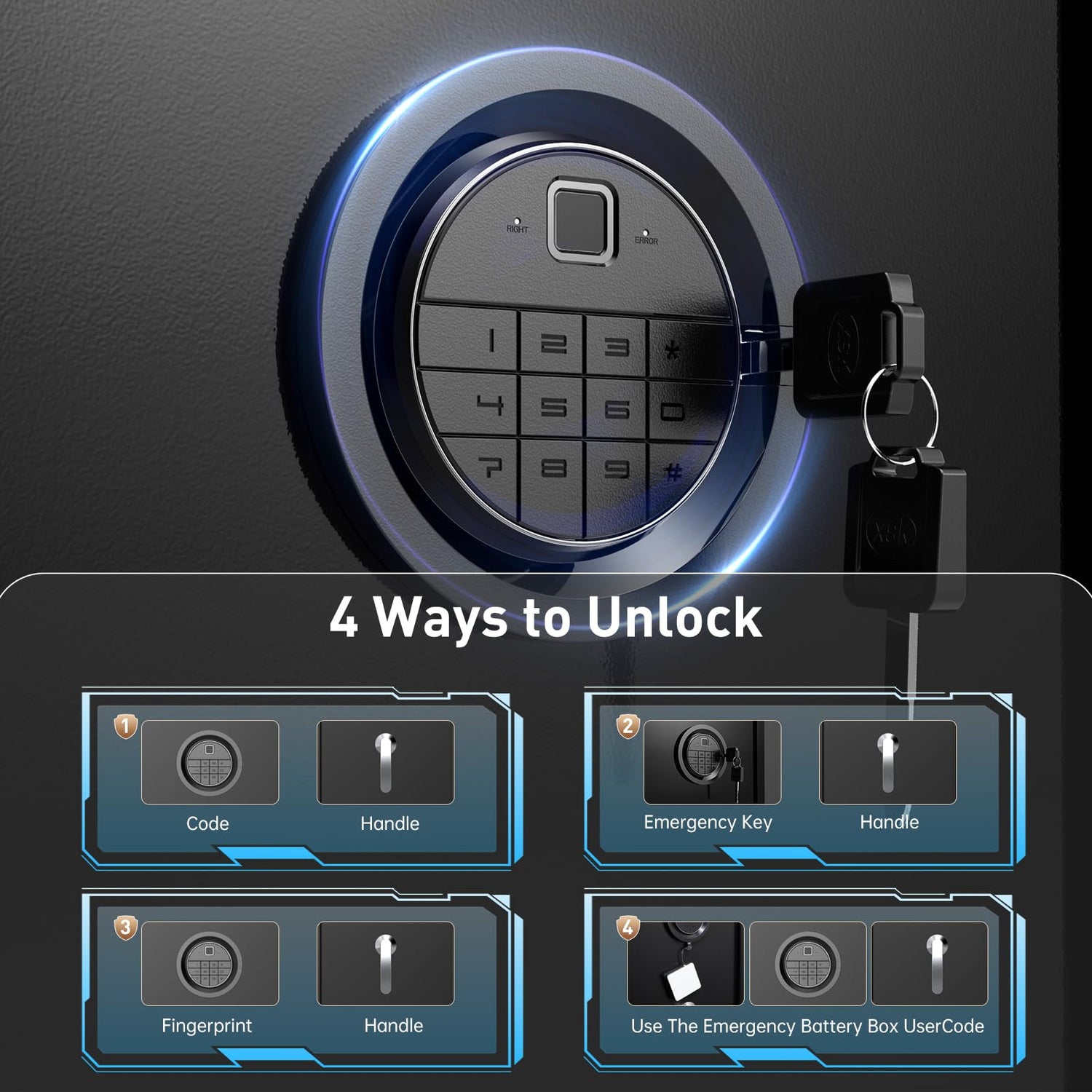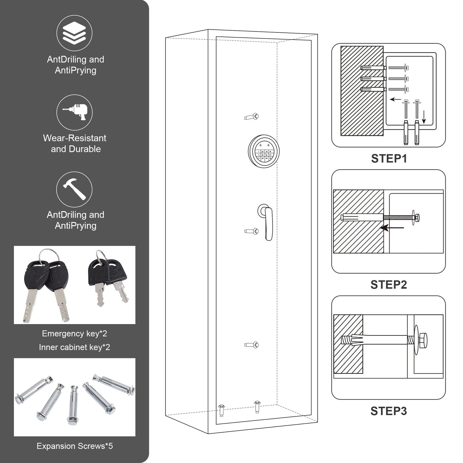 - š„Complete Accessories & Excellent Customer Serviceļ¼ Includes: 2 built-in lock cabinet keys, 2 keys, 5 screws,1 manual, 5 x Expansion screws, 1 x Emergency battry box, 1 x Instruction manual. We offer 24/7 customer service,If there are any problems with the gun safe, please feel free to contact us.