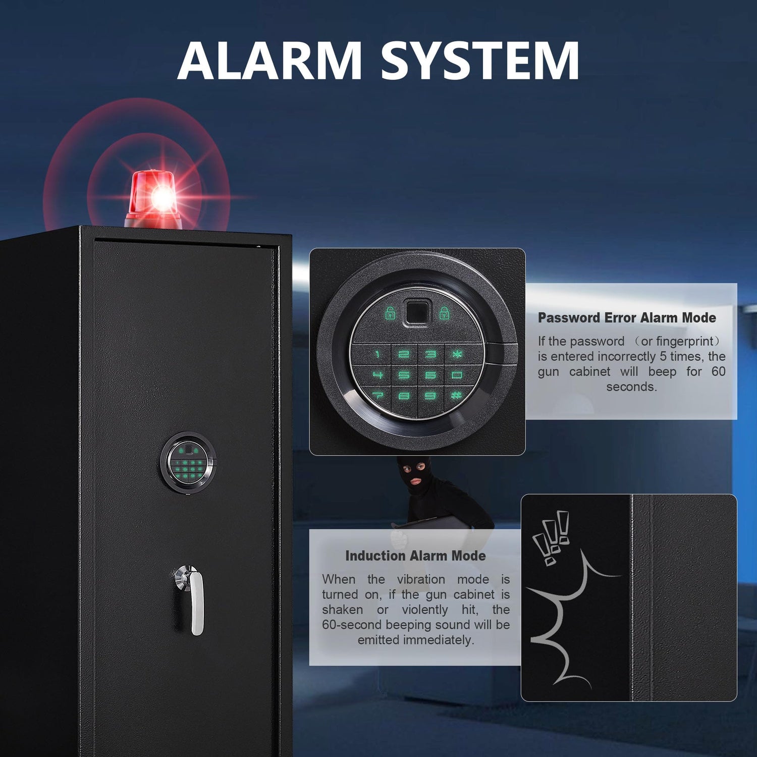- š„Wrong Password Alarm, Induction Alarm, Silent Mode: If you enter the wrong password three times in a row, the Gun Safe will automatically alarm. If the thief tries to move the gun safe, the gun safe will sound an inductive alarm. The double alarm system increases the security factor and protects your guns in all aspects. If you don't want the gun safe to sound, you can activate the silent mode.